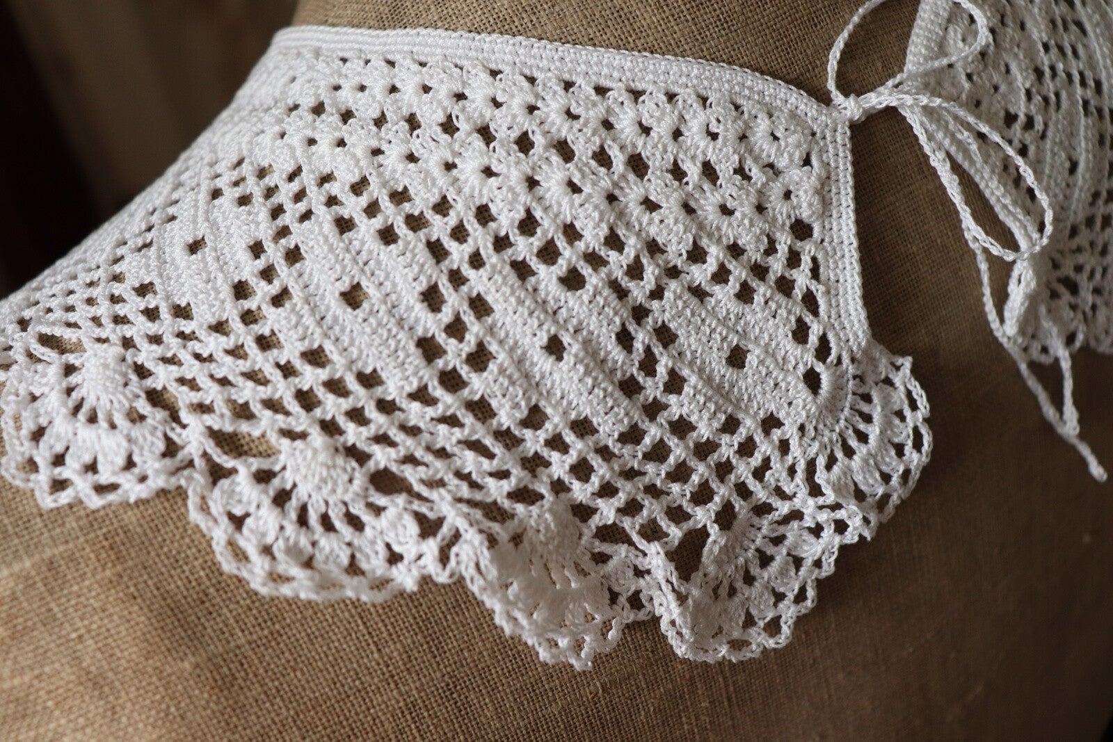 Heel fijntjes gehaakt is dit kraagje en in hele mooie staat. Het kraagje sluit met een strikje.