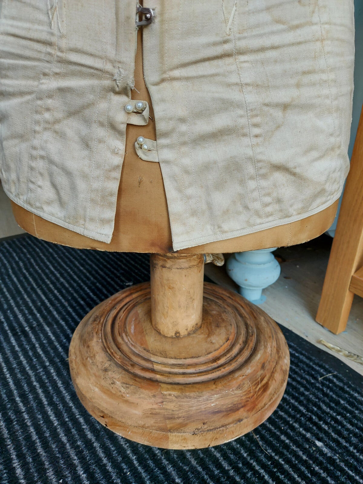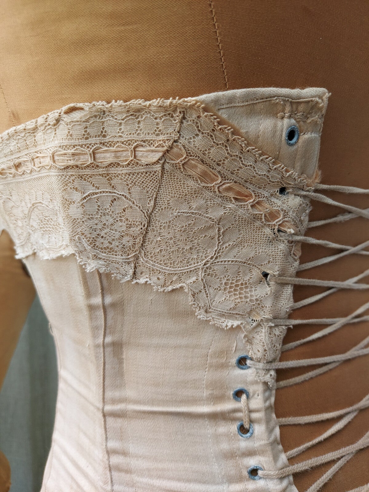 Antieke zijden Stockman corsetbuste met corset.