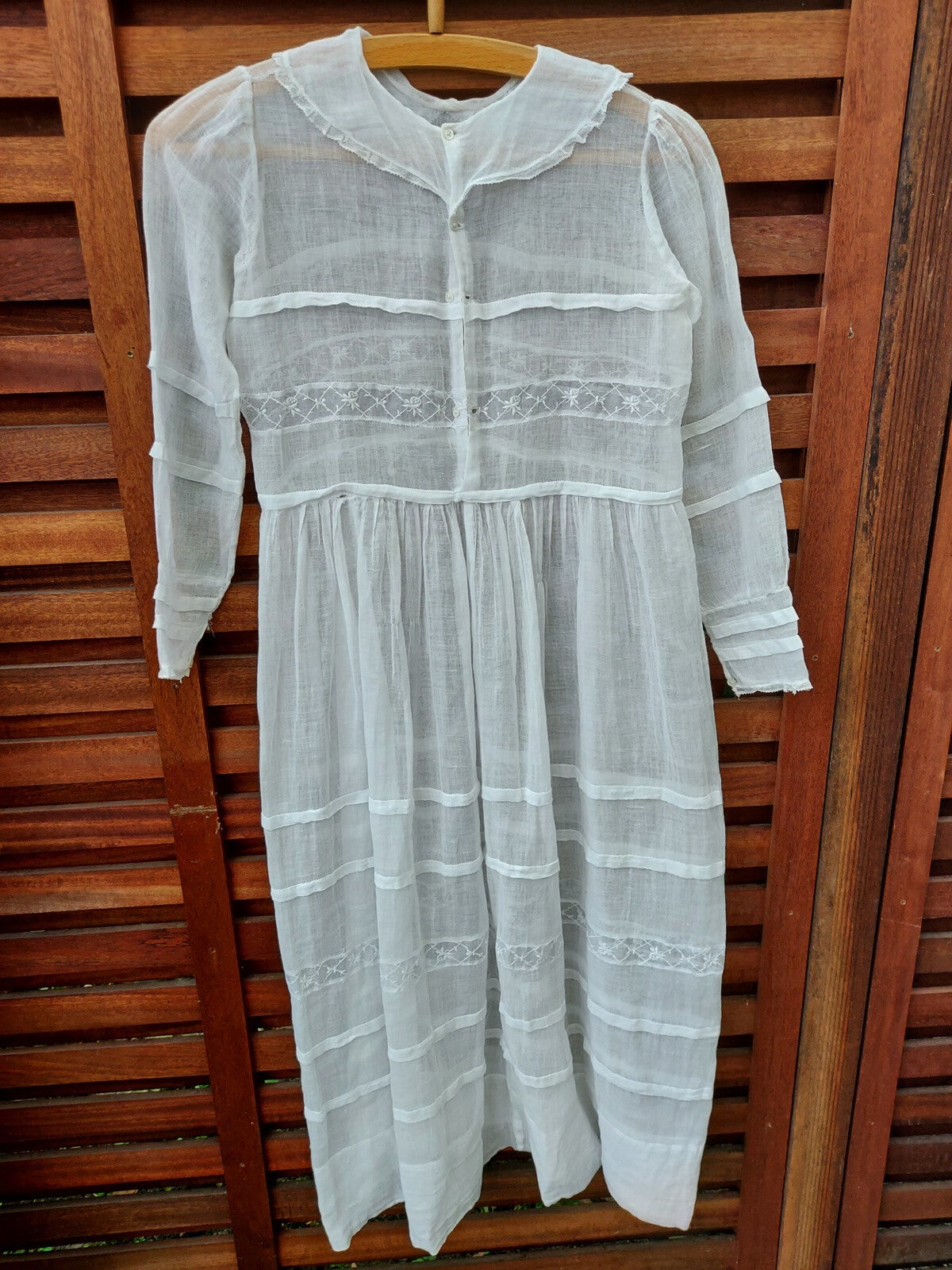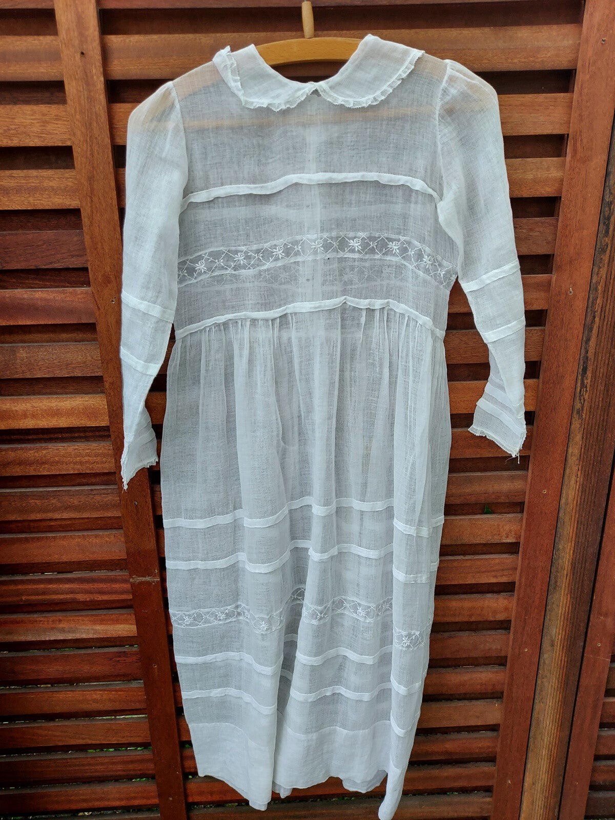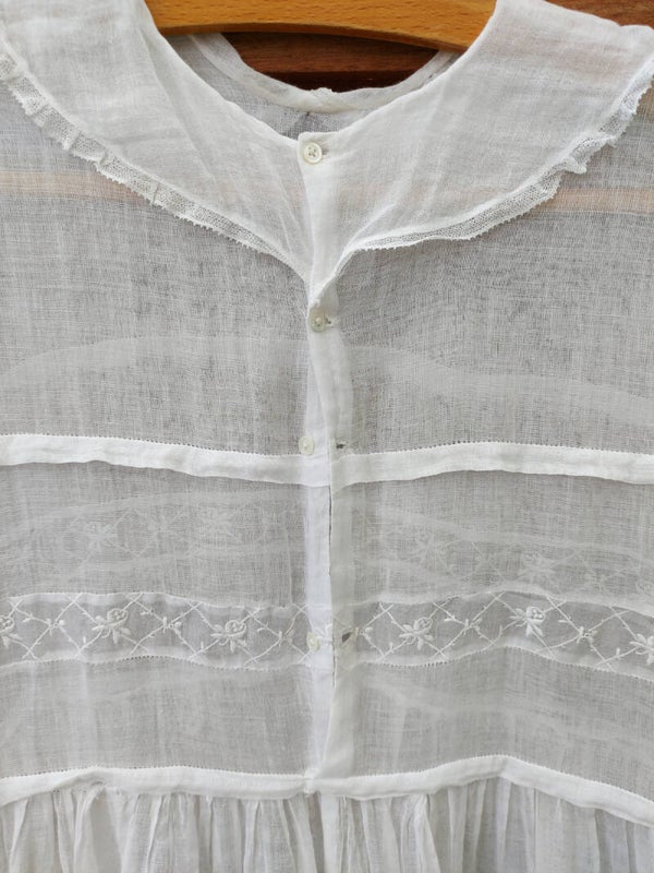 Zeer fragiele kinderjurk. Waarschijnlijk gebruikt voor een communie of als bruidsmeisje. Gezien de leeftijd in mooie staat.