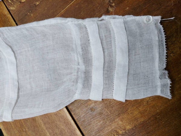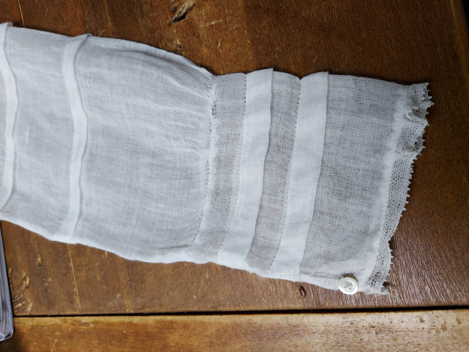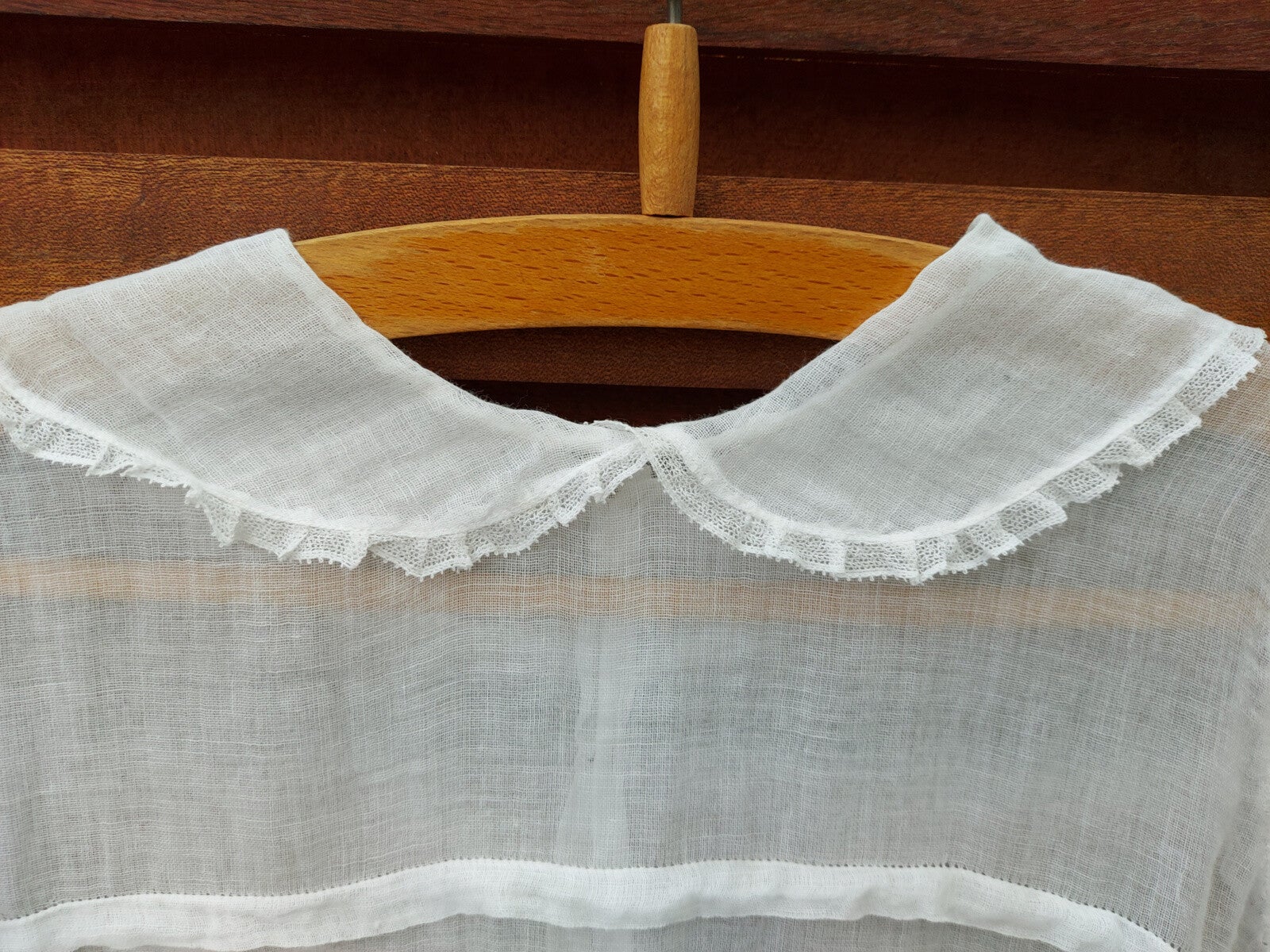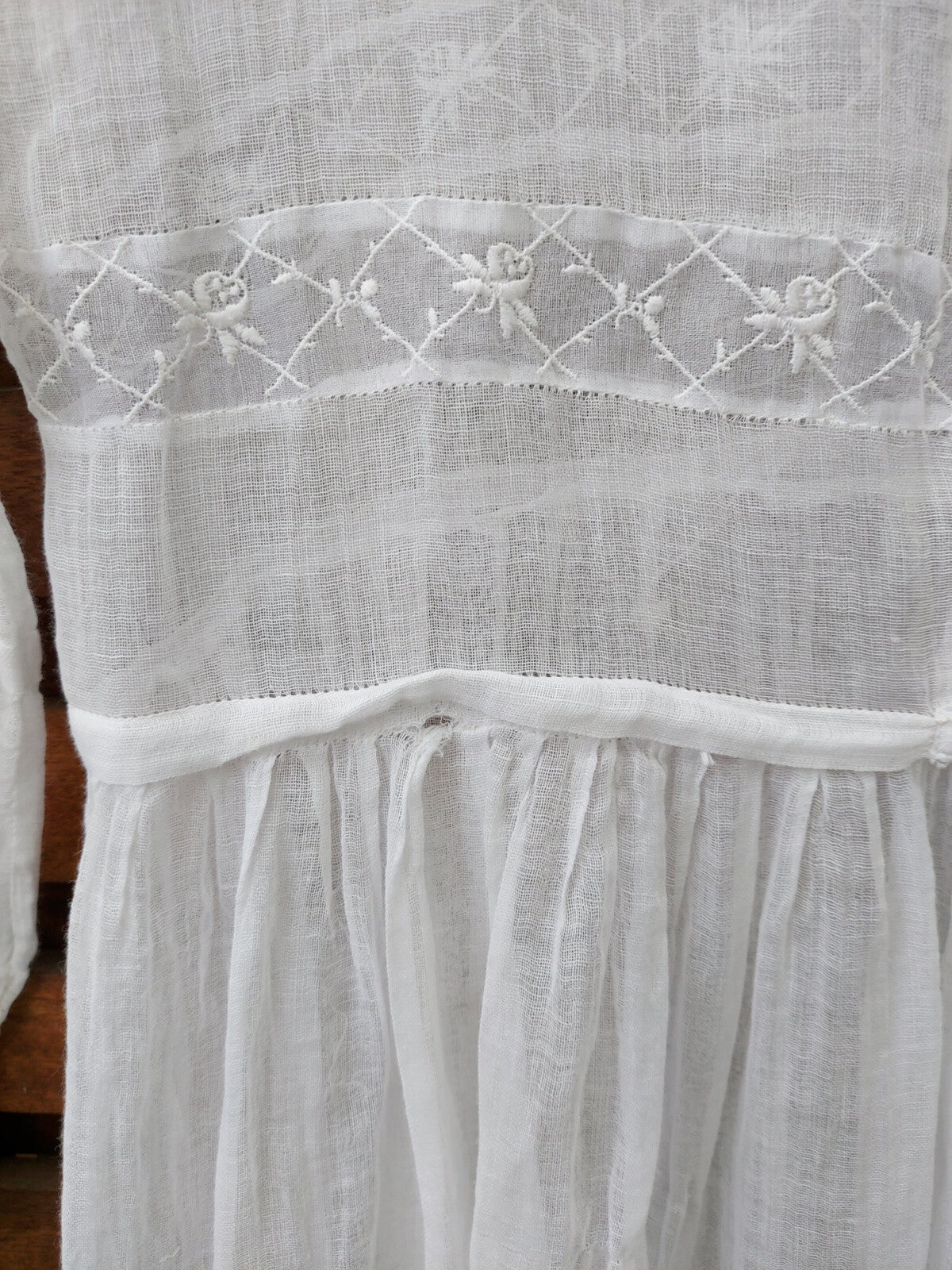 Zeer fragiele kinderjurk. Waarschijnlijk gebruikt voor een communie of als bruidsmeisje. Gezien de leeftijd in mooie staat.