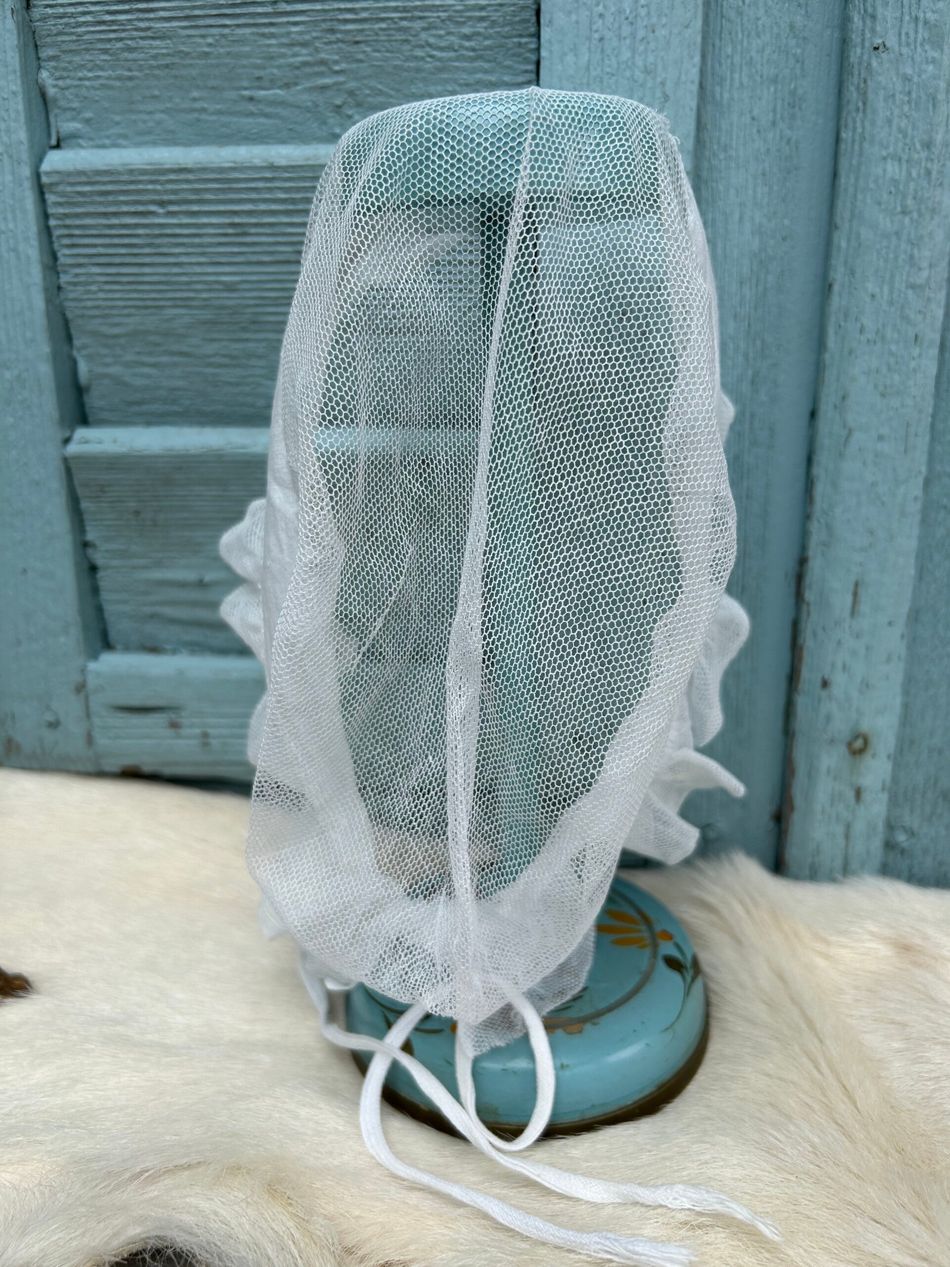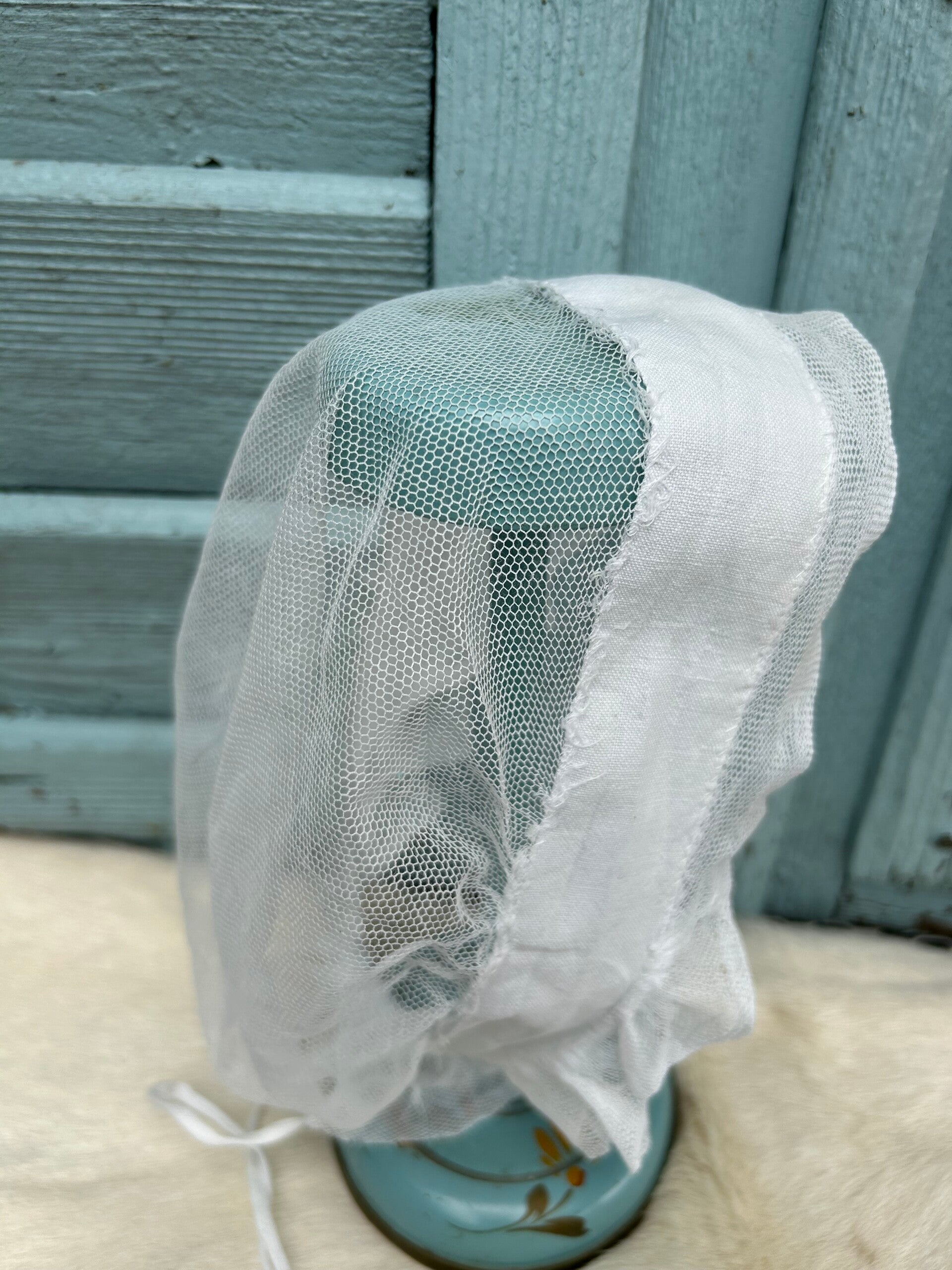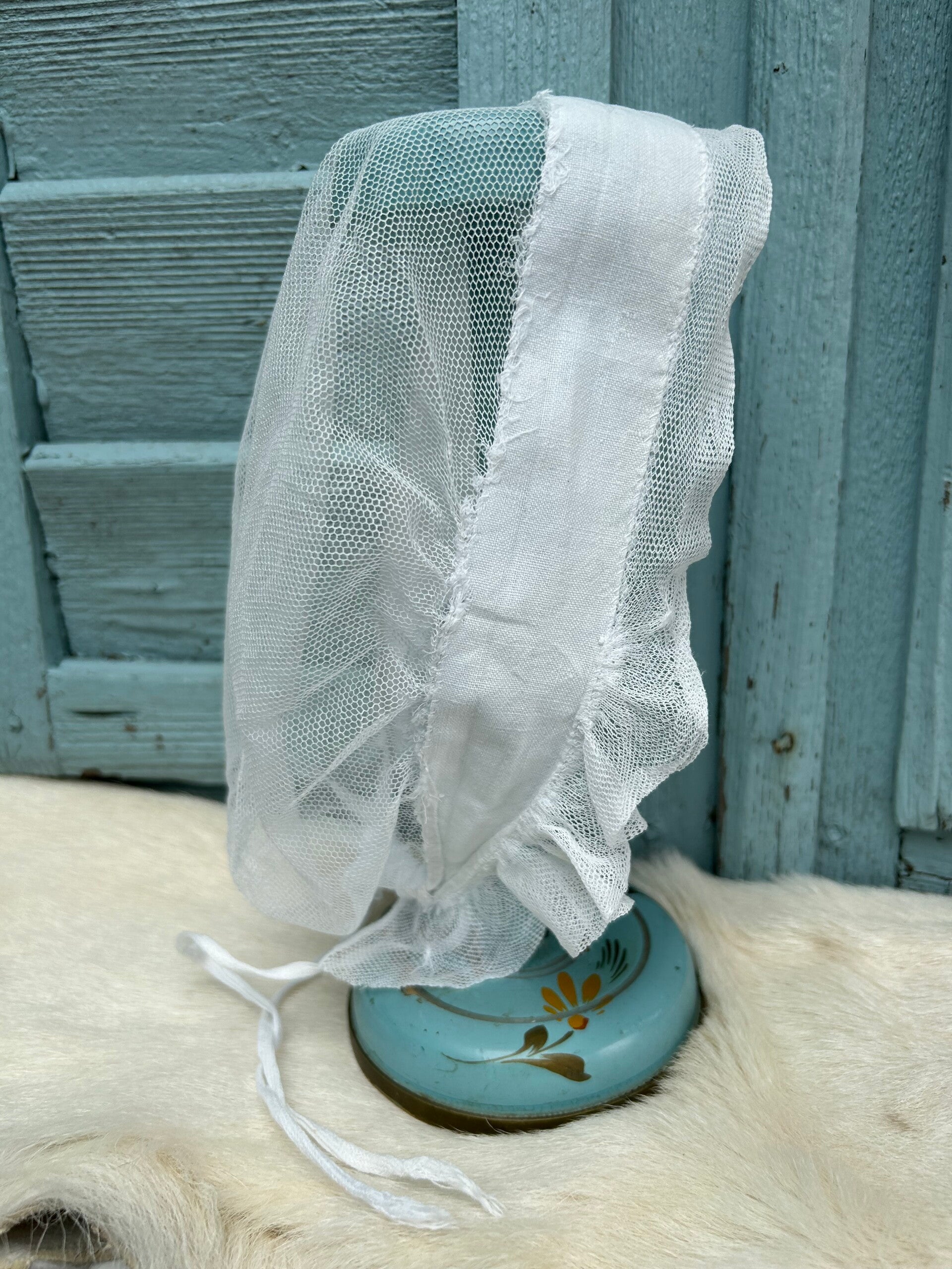 Veel gedragen kinderslaapmutsje, hier en daar wat kleine gaatjes.