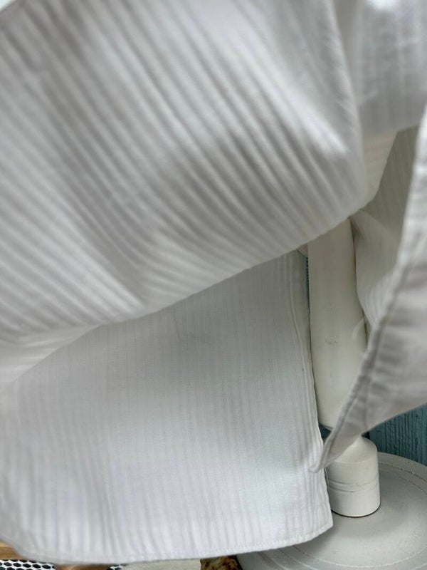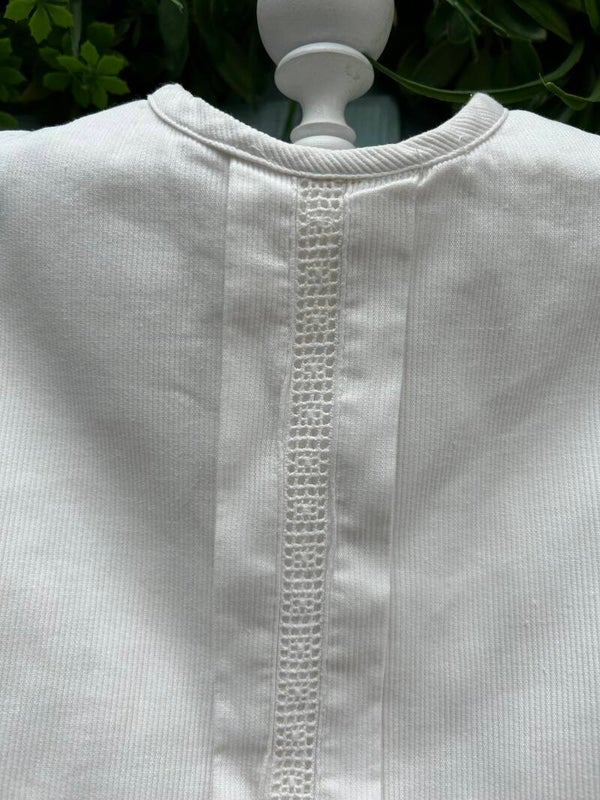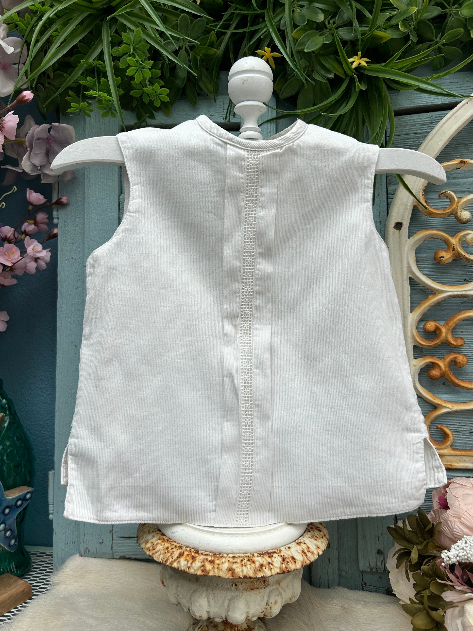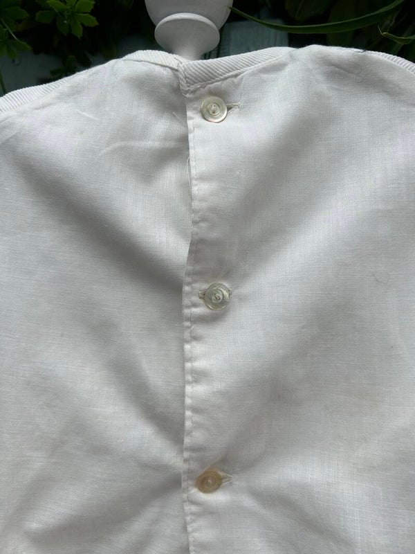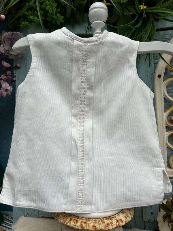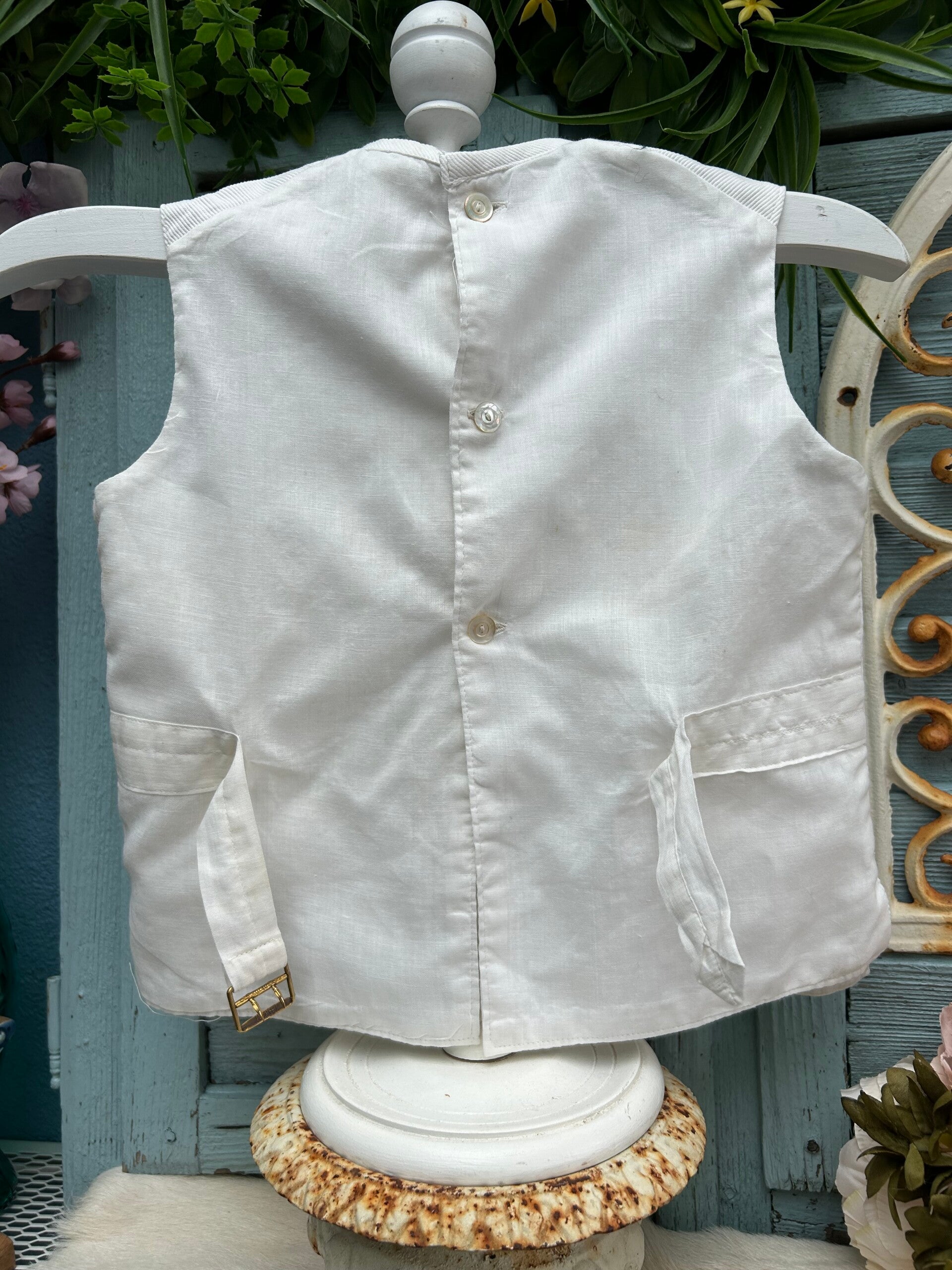 Mooie witte gilet voor kinderen. Sluit op de rug met knoopjes en gesp.