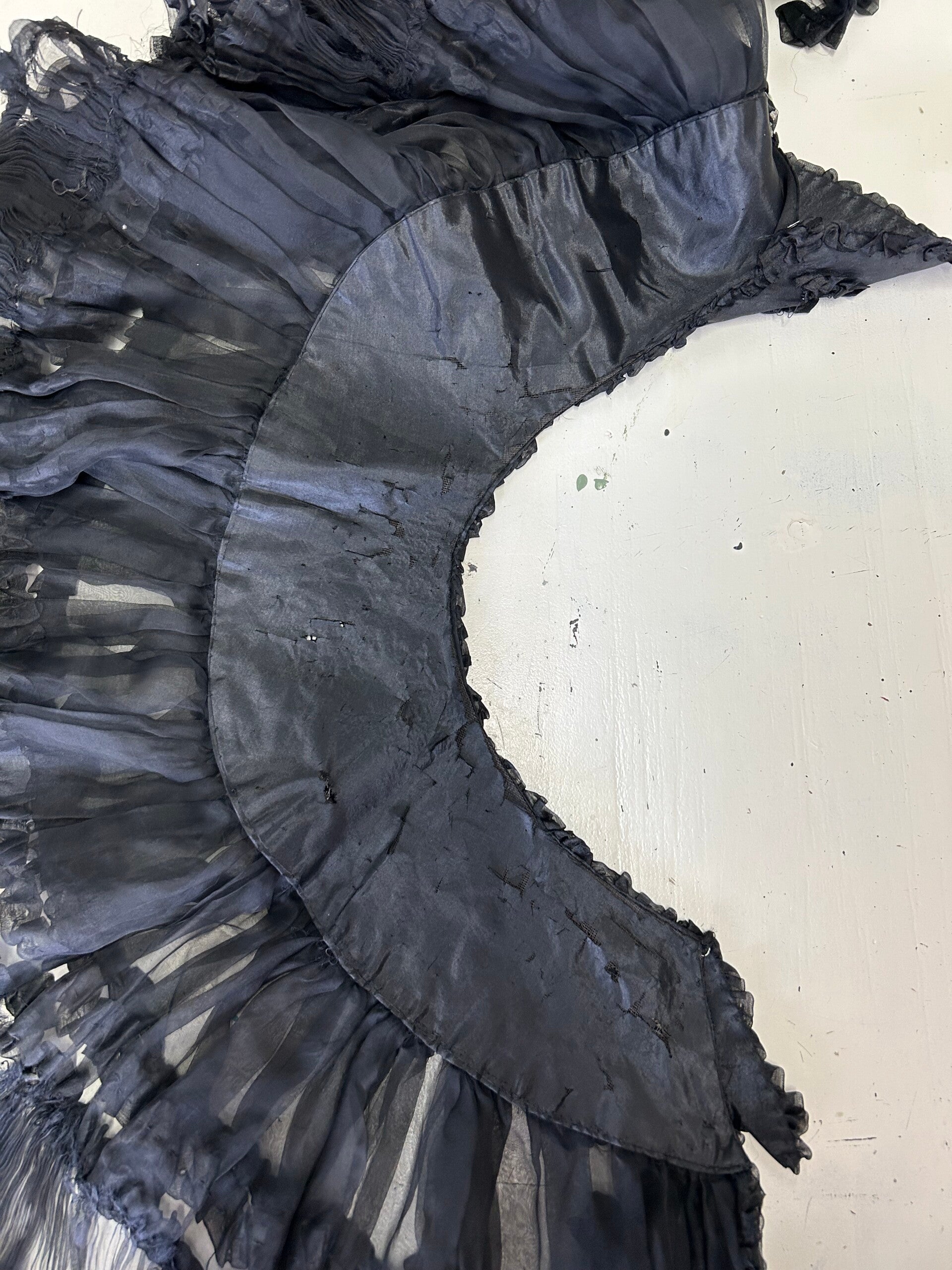Mooie pelerine gemaakt van zwarte zijde en voile. Op de voile zijn van zijde roesjes genaaid en kanten applicaties als versiering aangebracht. Op het gedeelte wat van zijde is, zitten applicaties van zijde. Gezien de leeftijd ziet deze pelerine er nog prachtig uit. De binnenzijde vertoond gaatjes en slechts aan een kant laat de voile een beetje los. Dit zie je niet als de pelerine op een paspop zit. Ze sluit aan de bovenzijde met een haakje en is verder ook te sluiten met de striklinten