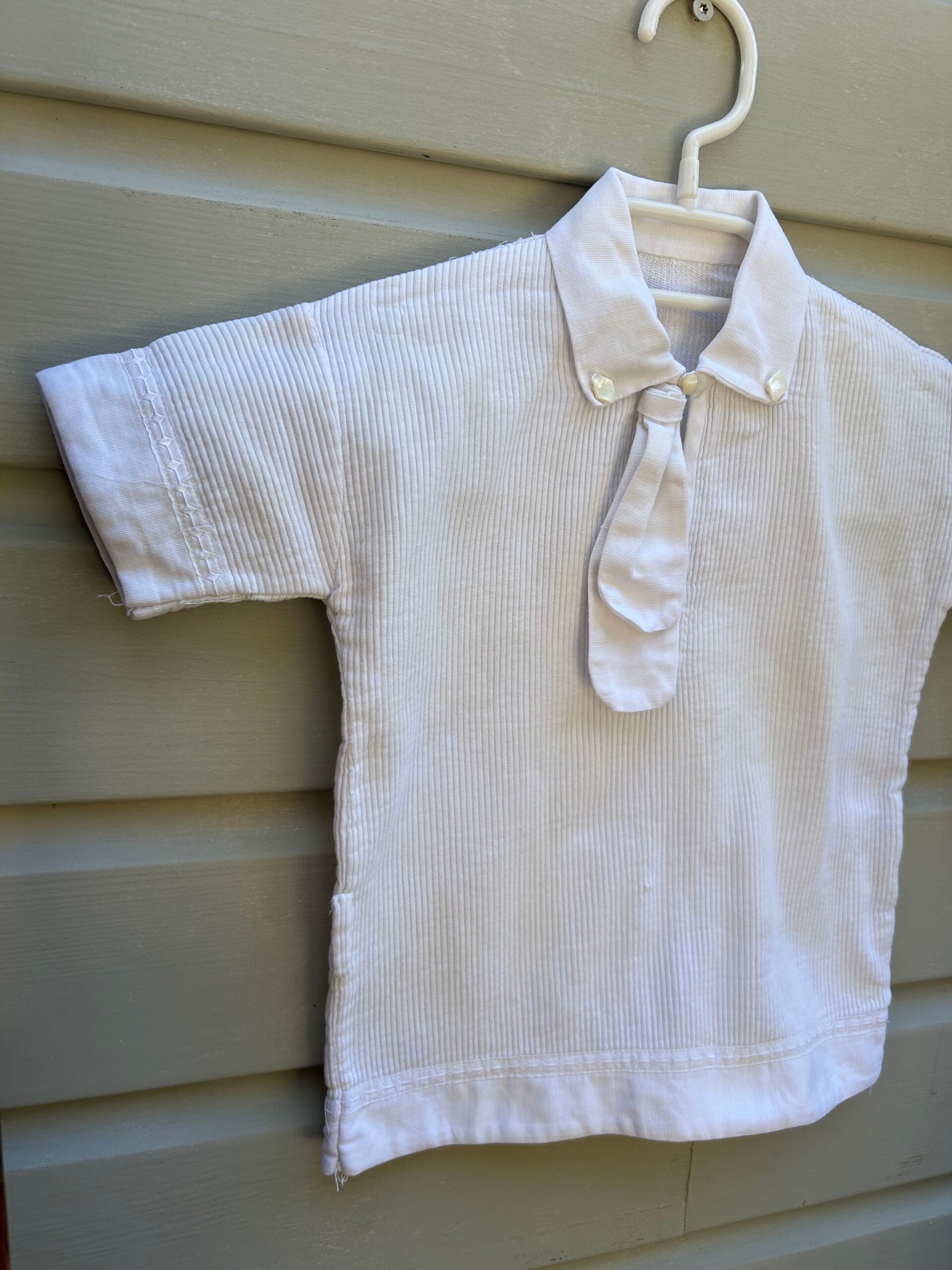 Katoenen blouse met stropdasje. Gemaakt van gerimpeld katoen, voelt stevig aan. Is niet helemaal wit, heeft wat lichte gelige vlekken, maar is moeilijk te zien!