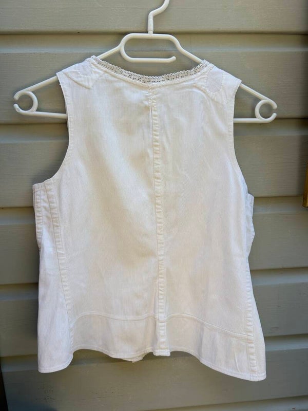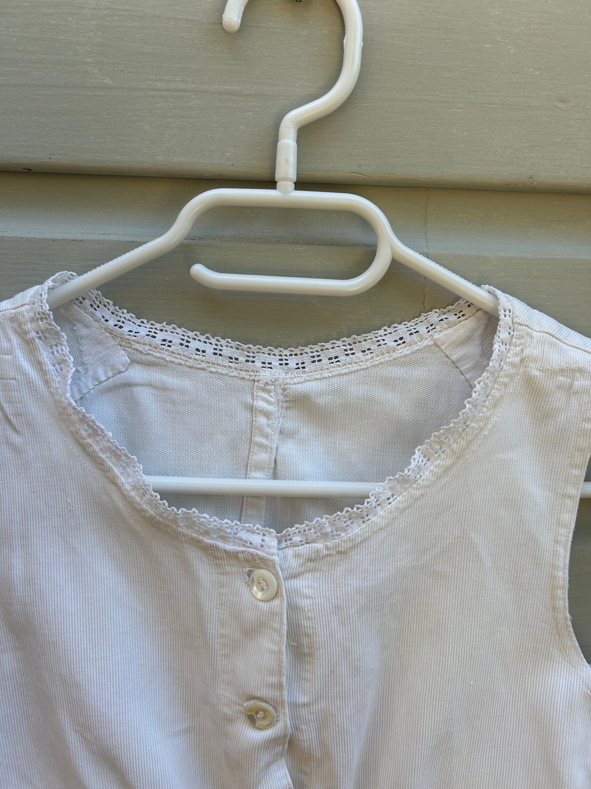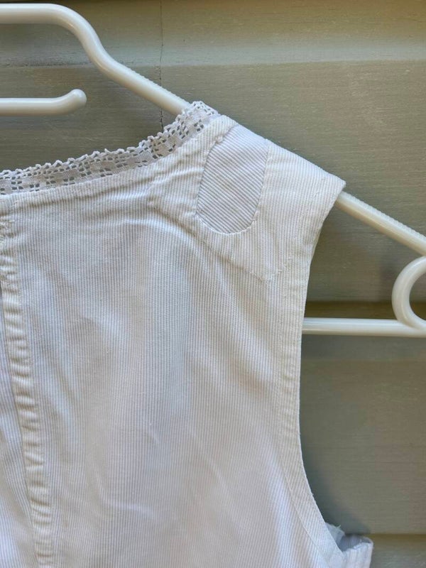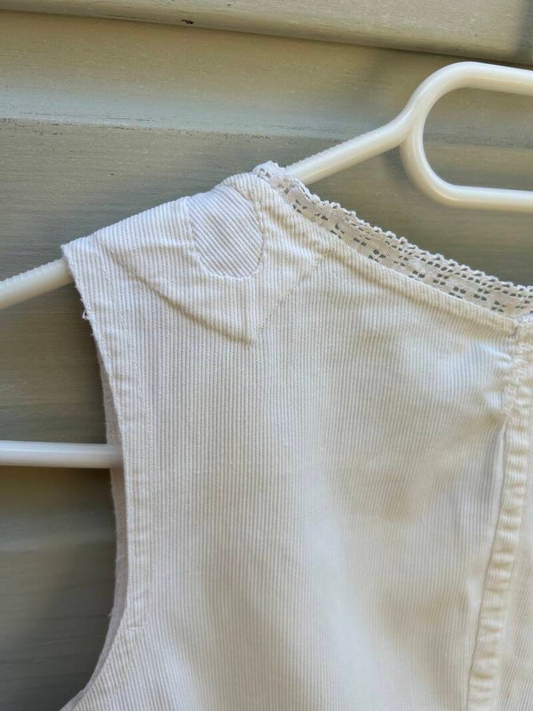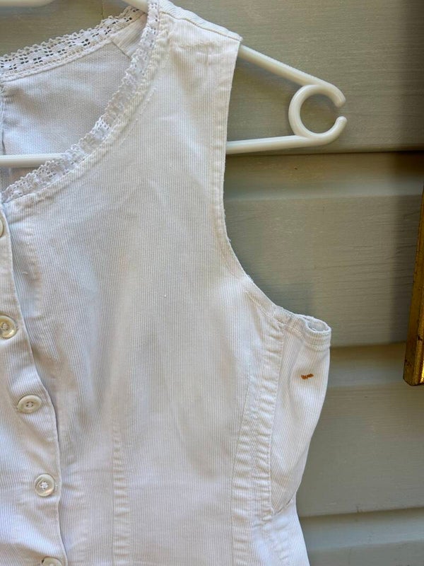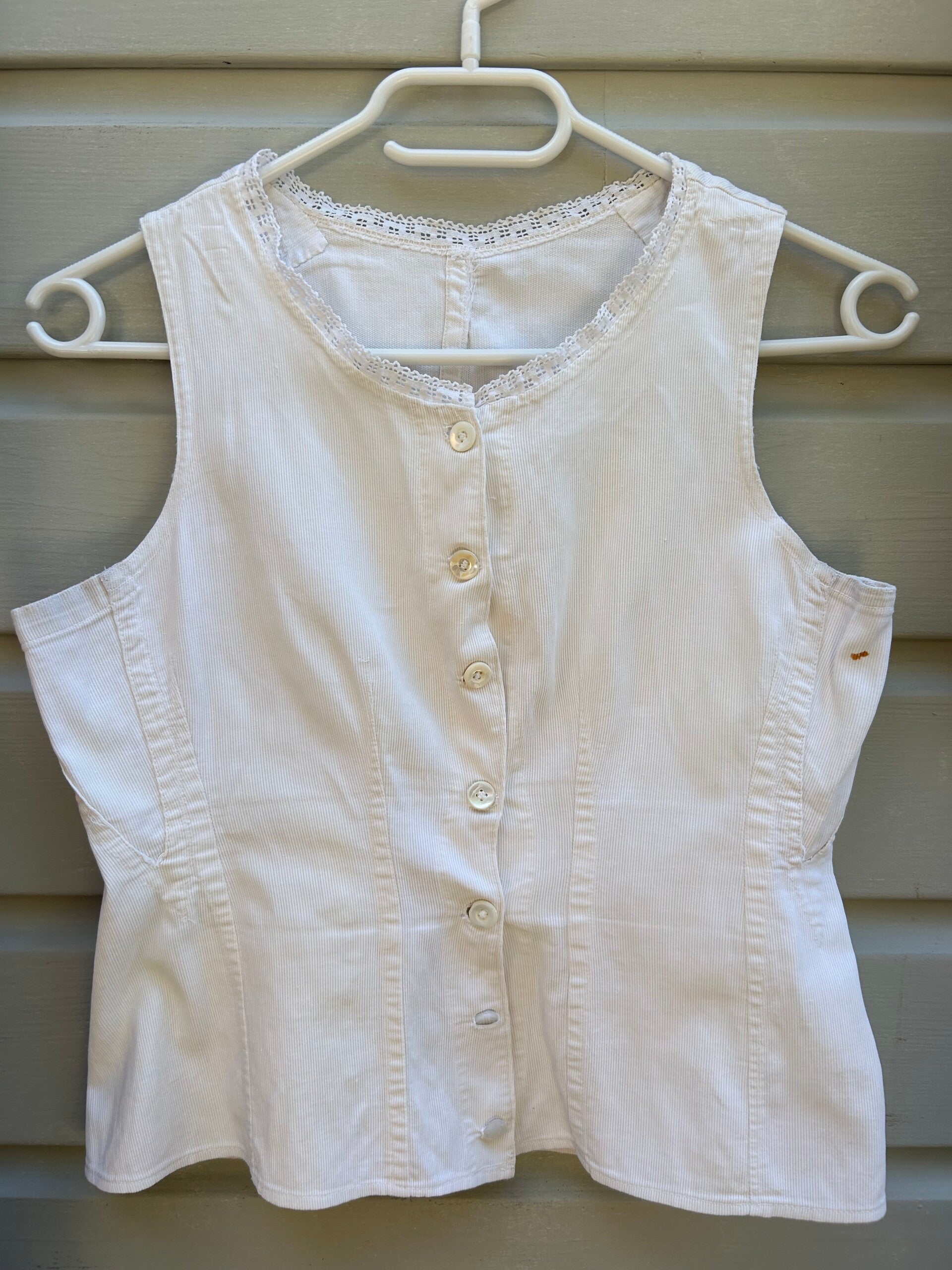 Gilet gemaakt van stevig geribbeld katoen. Aan de hals afgewerkt met een kantje, sluit aan de voorzijde met knoopjes. Heeft een vlekje onder de linker oksel.