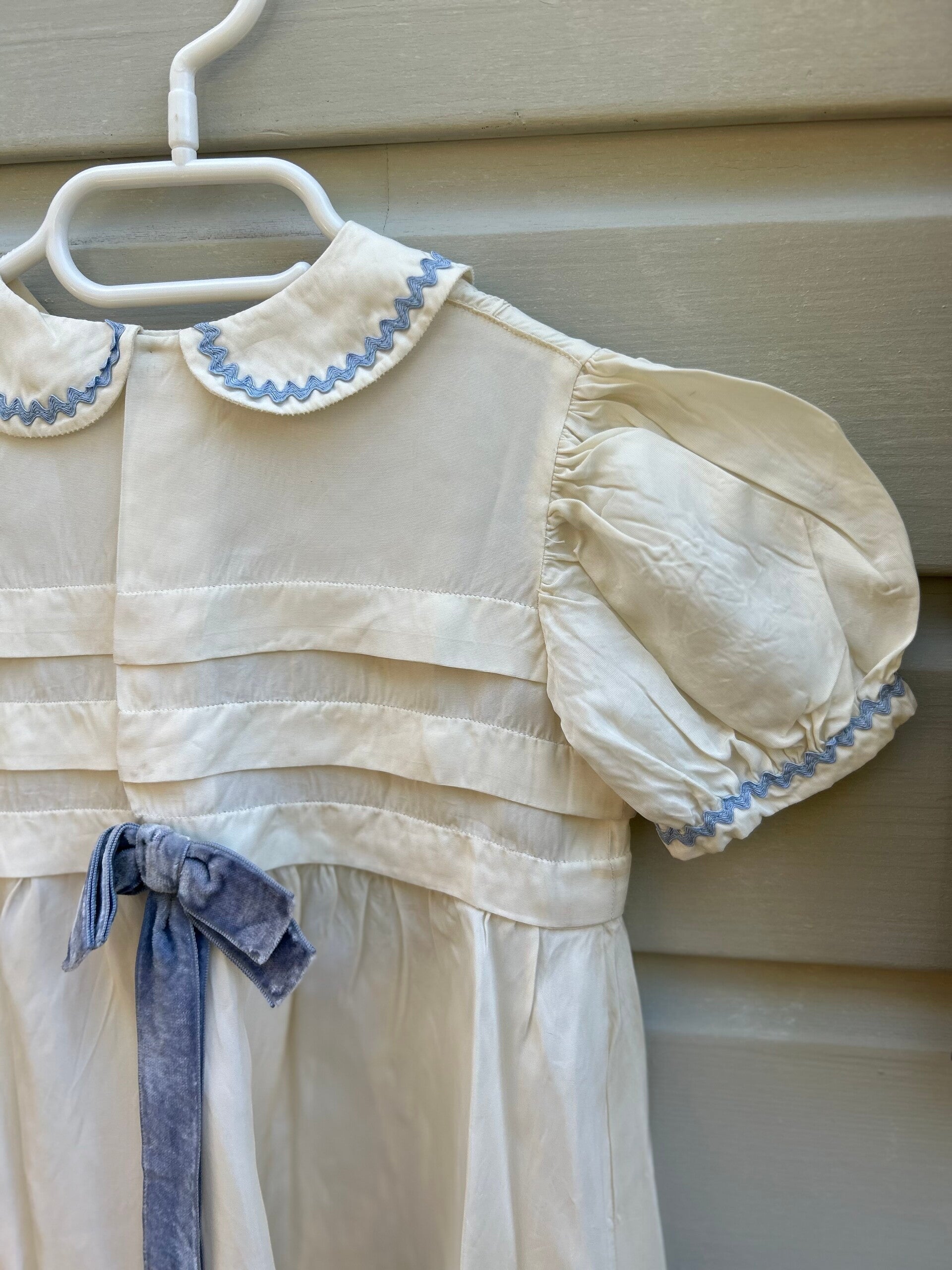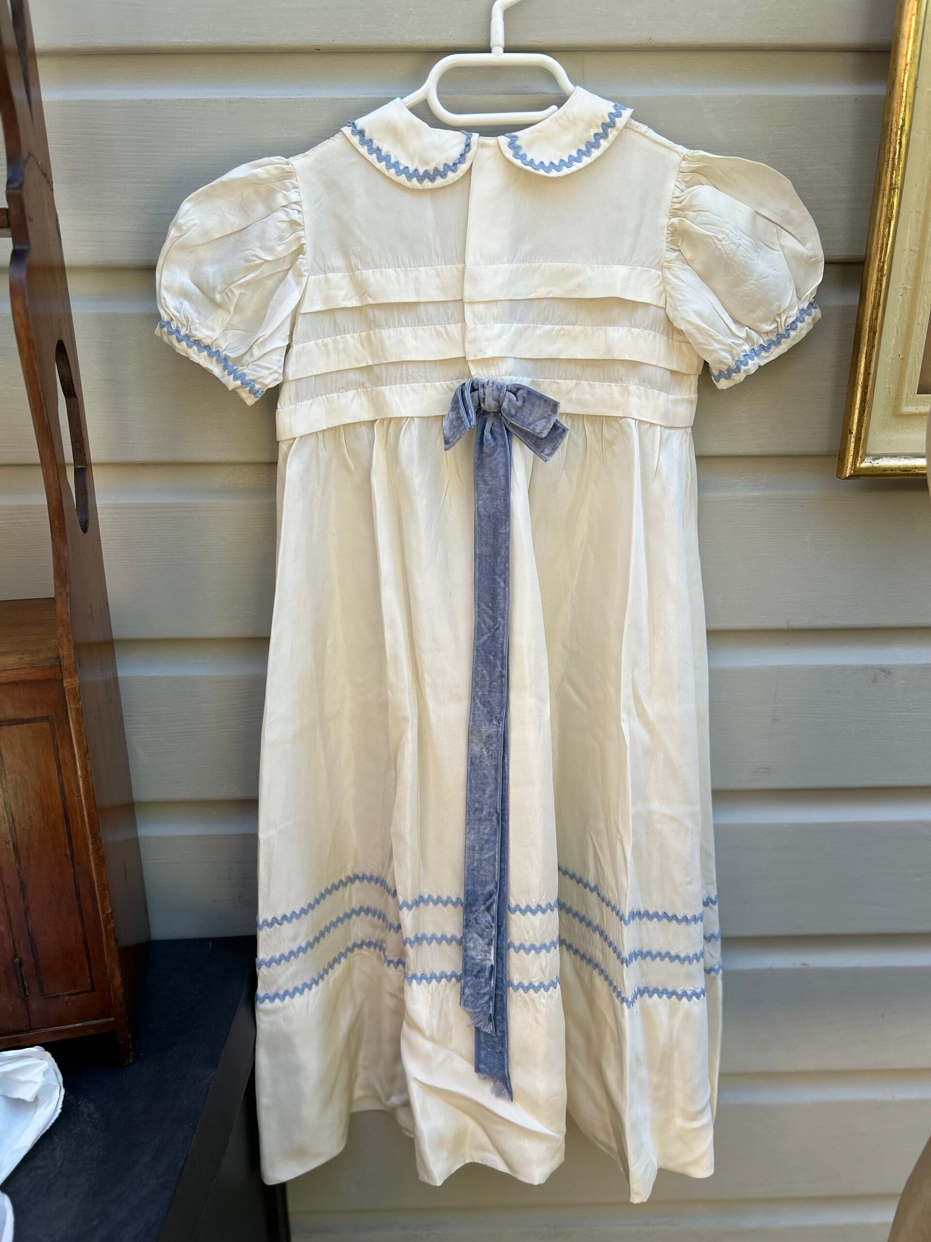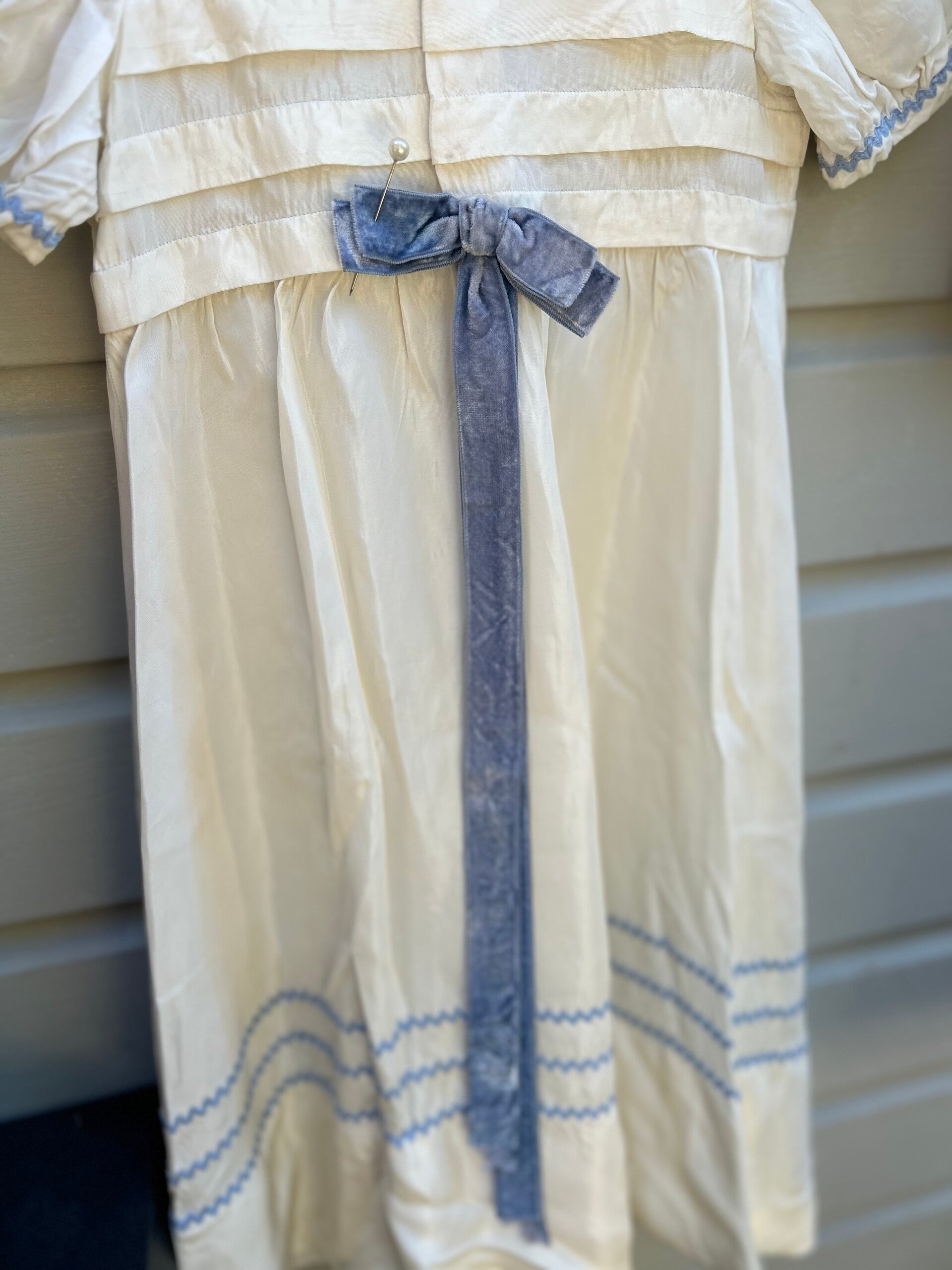 Zo mooi is deze jurk, gemaakt van een soort zijdeachtige stof in de kleur beige. Afgezet met blauw zigzagband en een strik van fluweel op de rug. Verkeert in hele mooie staat.