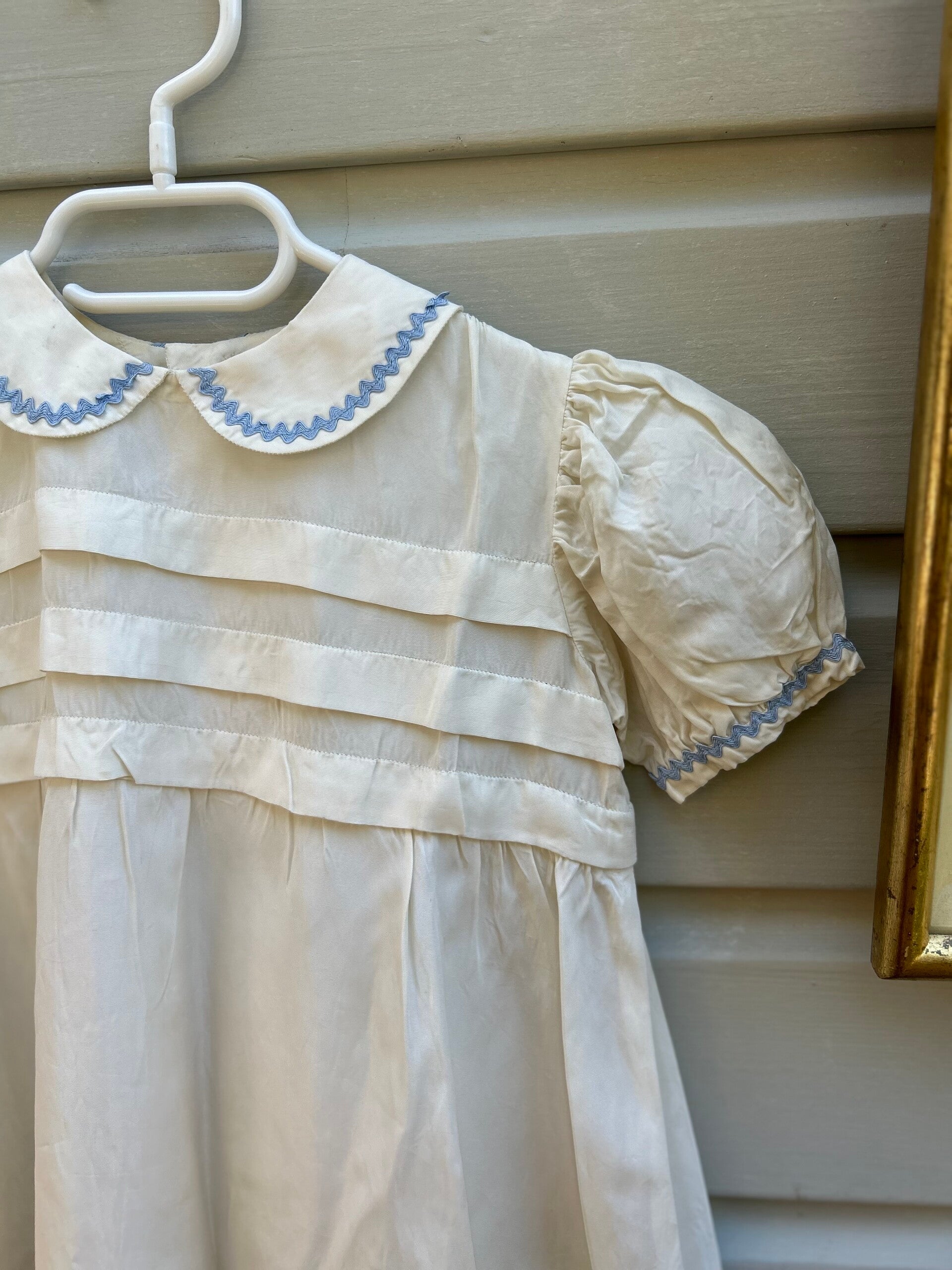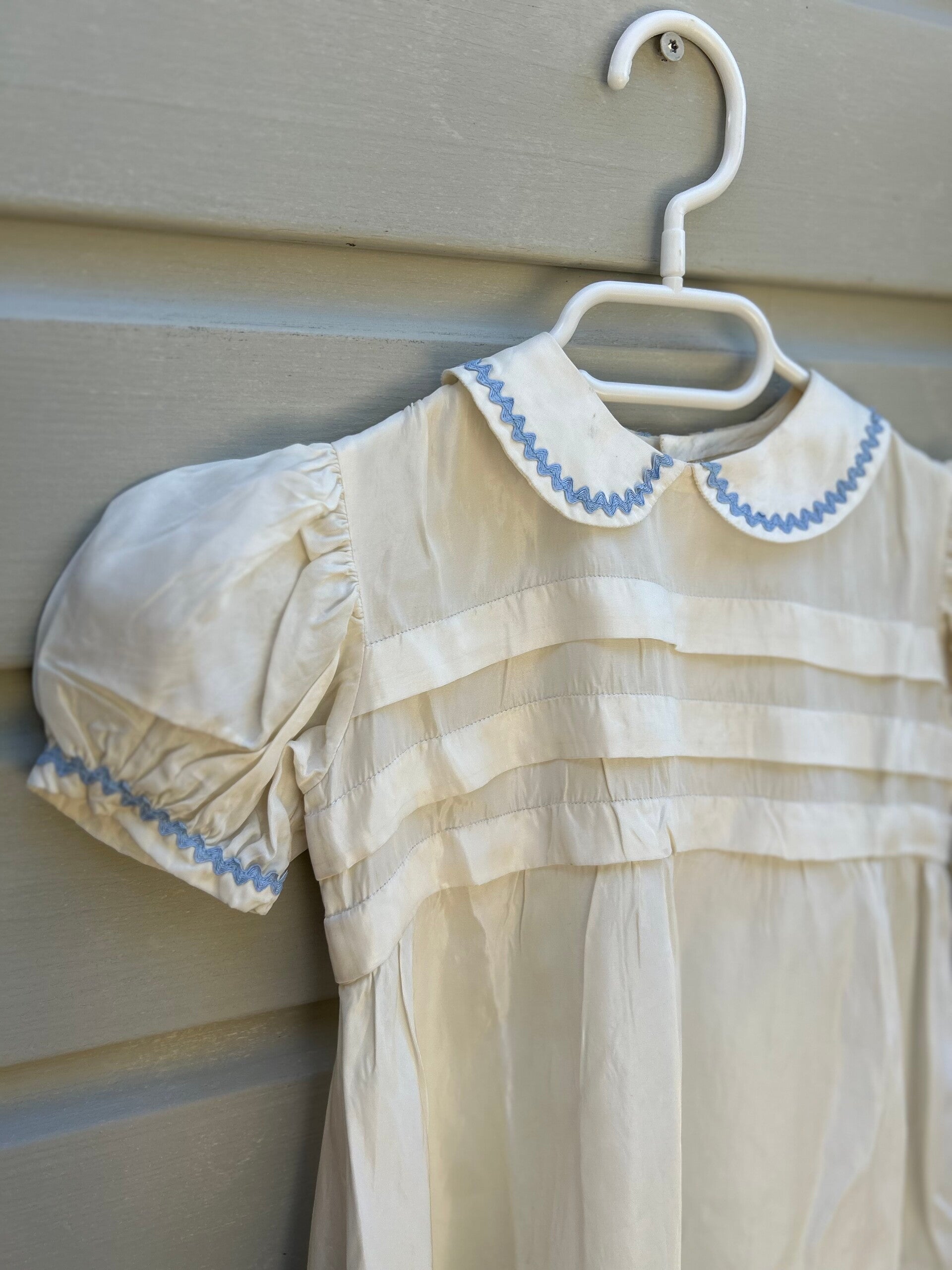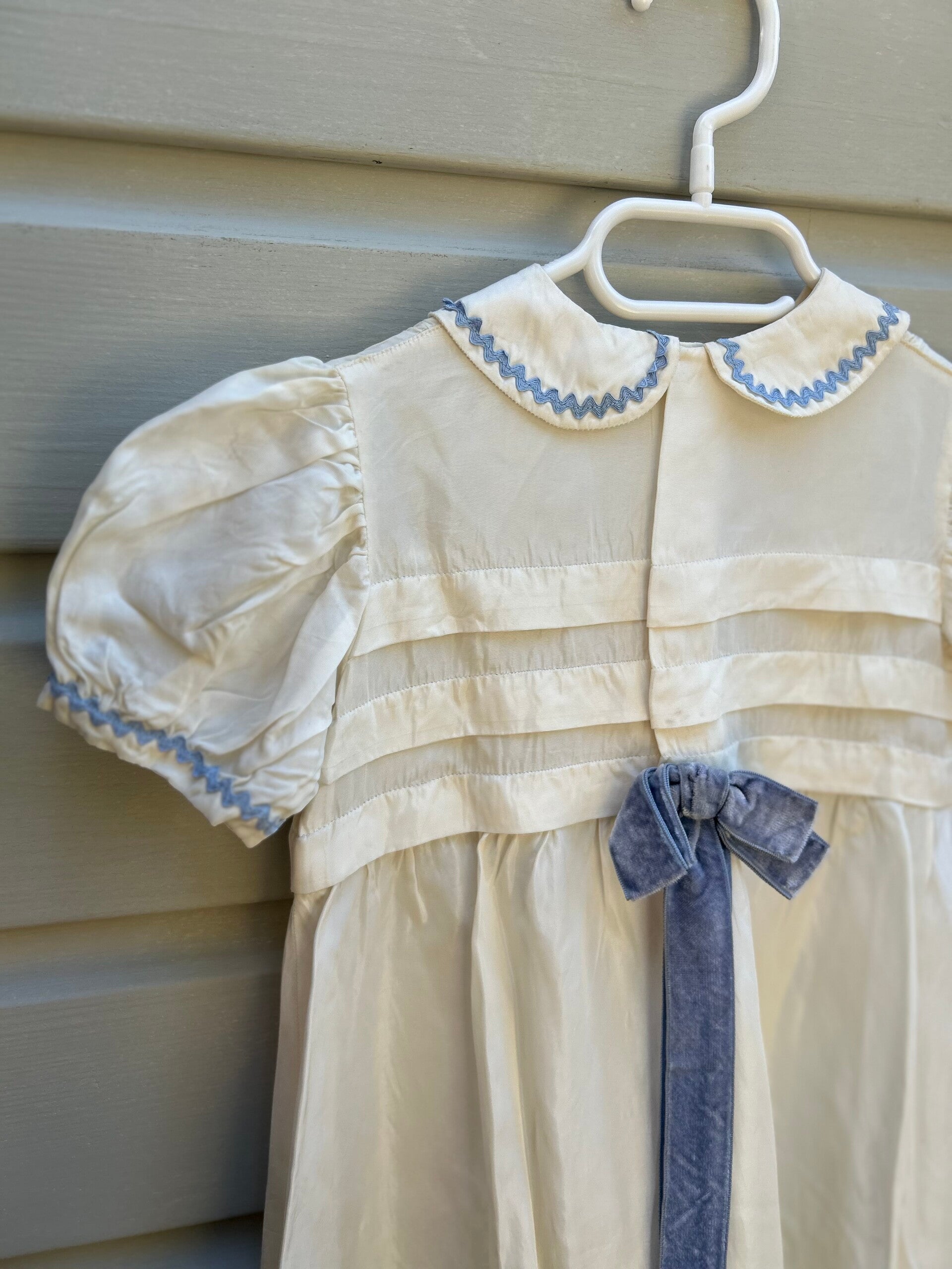 Zo mooi is deze jurk, gemaakt van een soort zijdeachtige stof in de kleur beige. Afgezet met blauw zigzagband en een strik van fluweel op de rug. Verkeert in hele mooie staat.