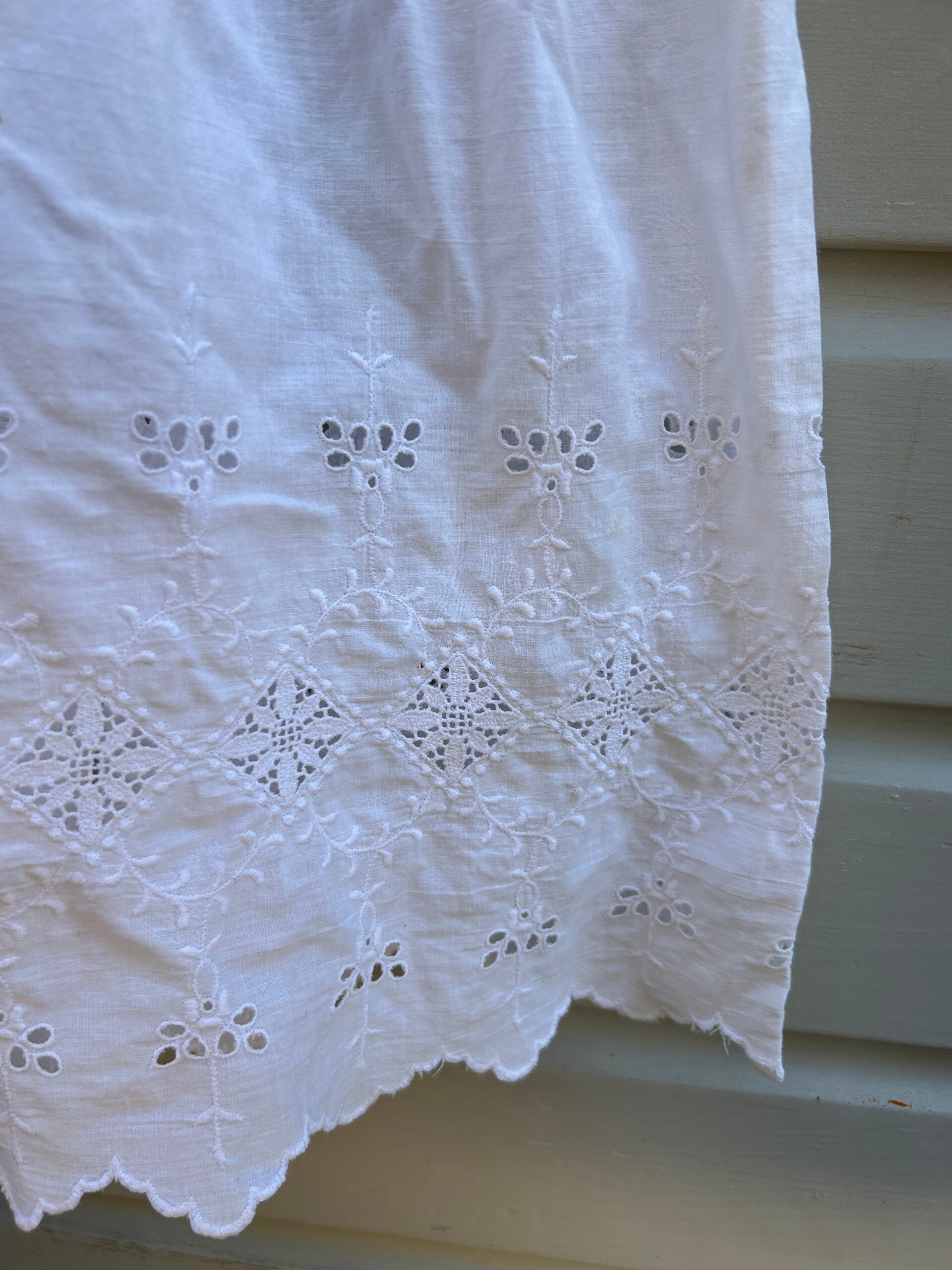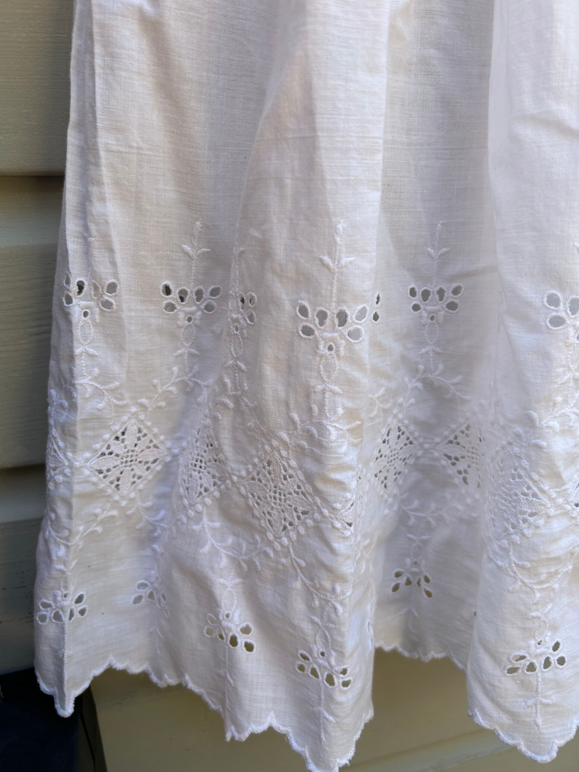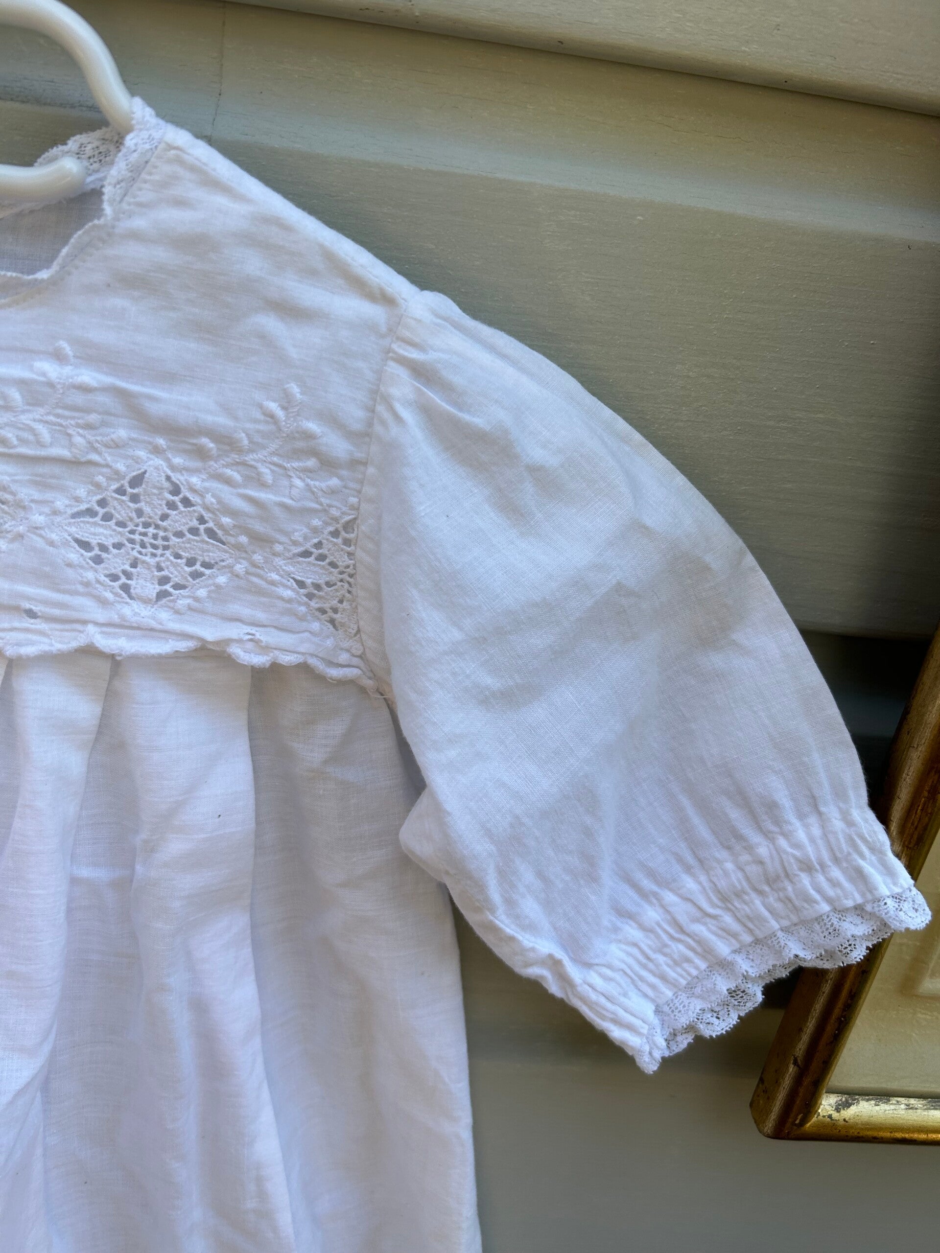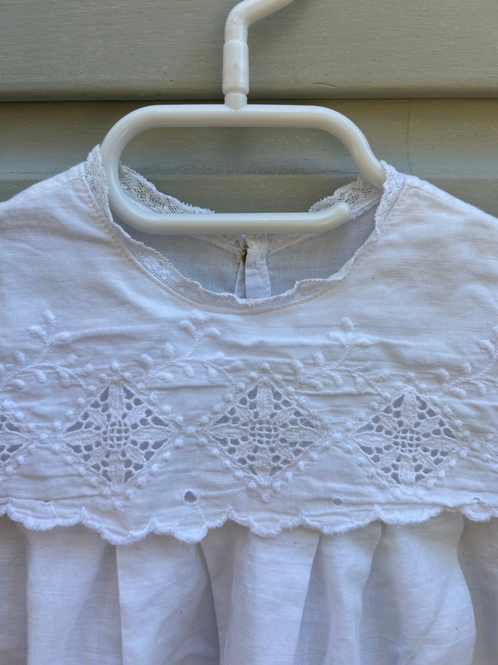 Een lief klein spierwit jurkje. Op de foto's lijkt de kleur af te wijken maar het is echt spierwit. Sluit met drukkertjes op de rug.