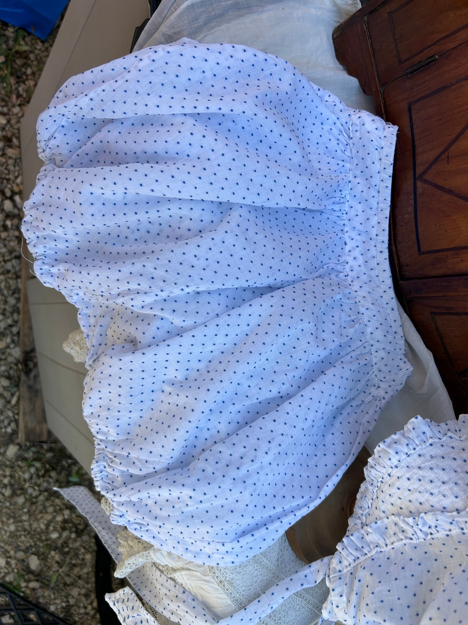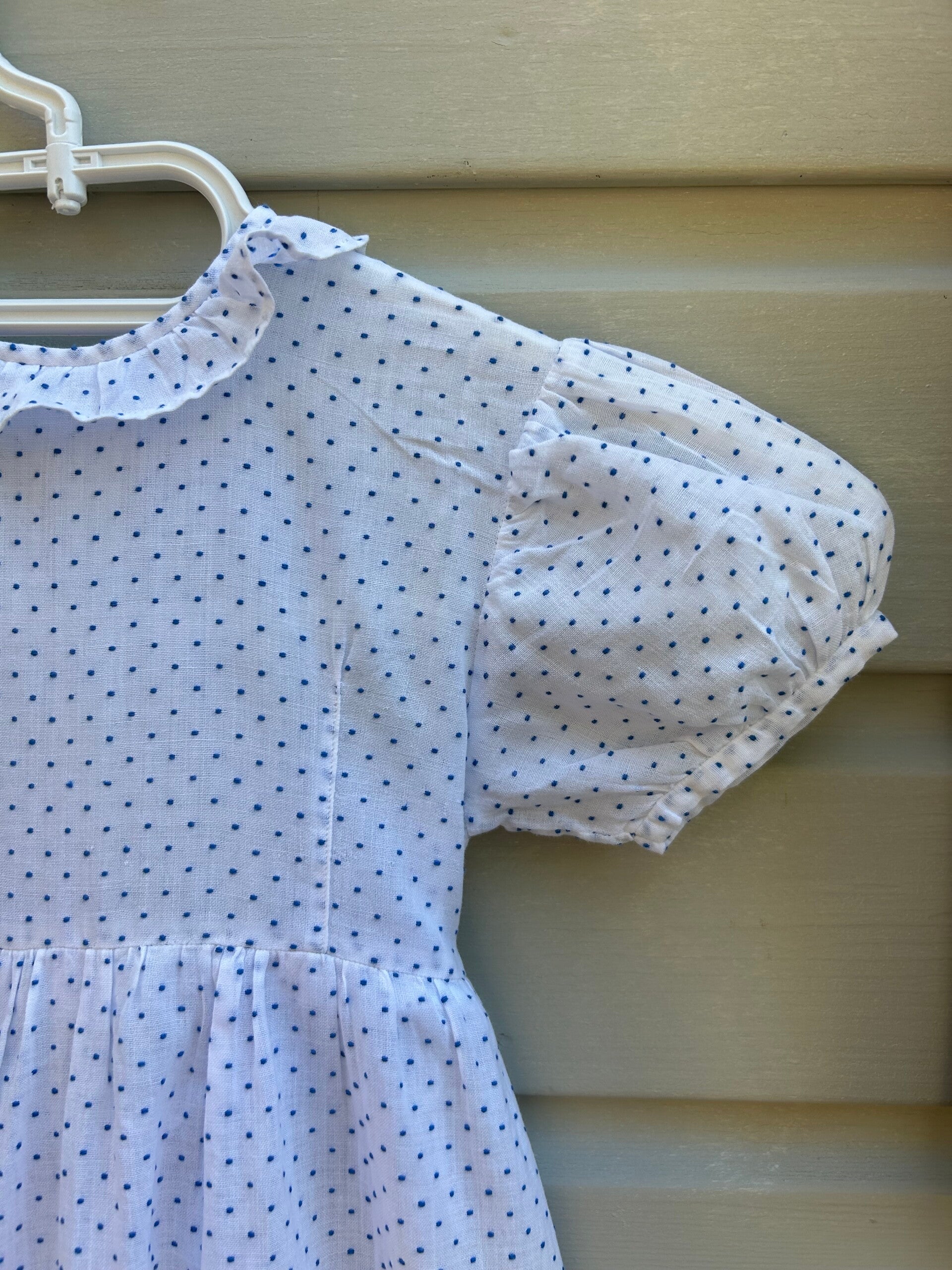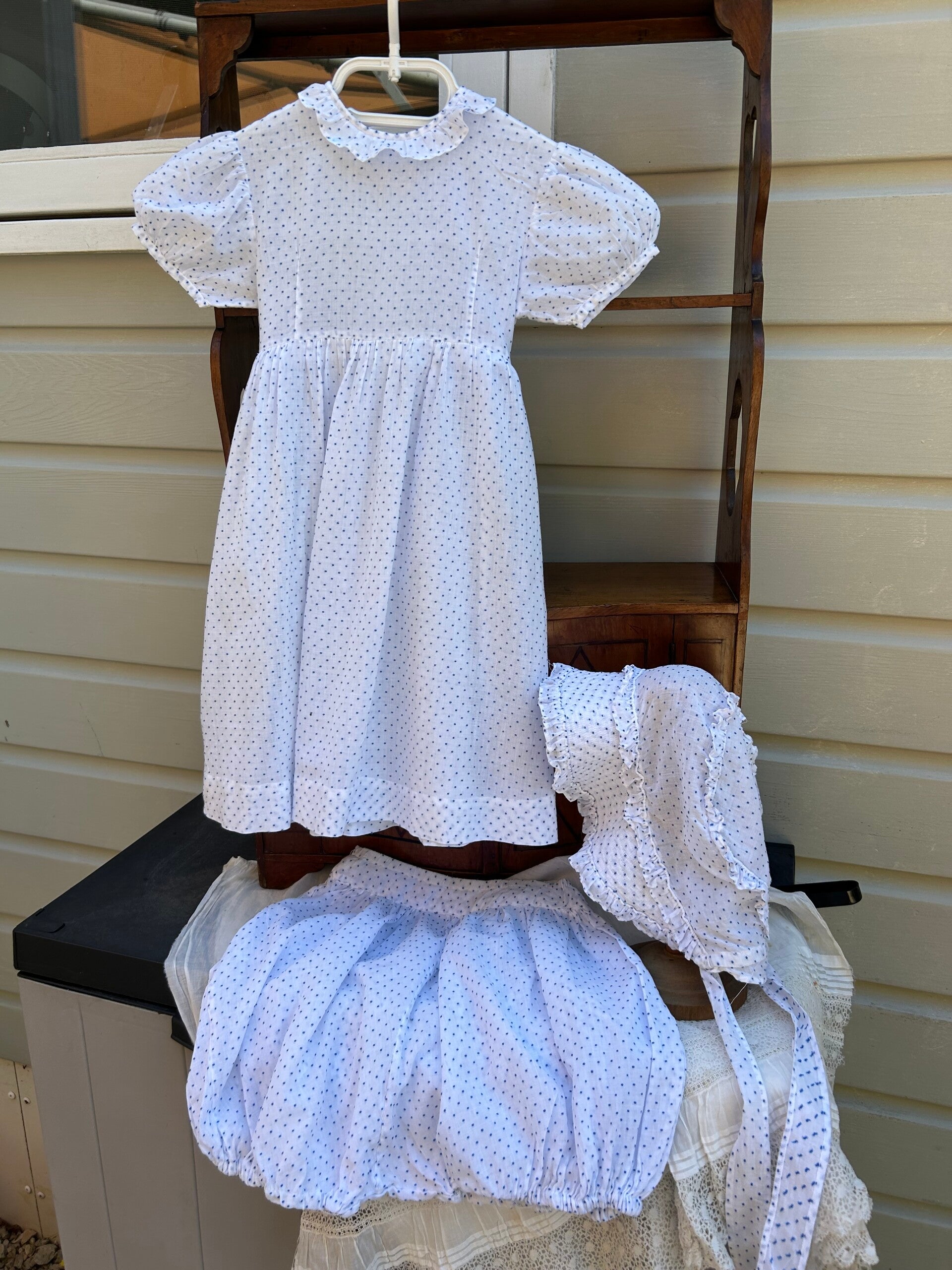 Lief jurkje, wit met blauwe stipjes in mooie lichte katoen. Bij de jurk hoort een broekje en een muts, gemaakt van dezelfde stof. De jurk sluit met drukkers op de rug en een ceintuur die eveneens op de rug gestrikt kan worden. Verkeert in een hele mooie staat.