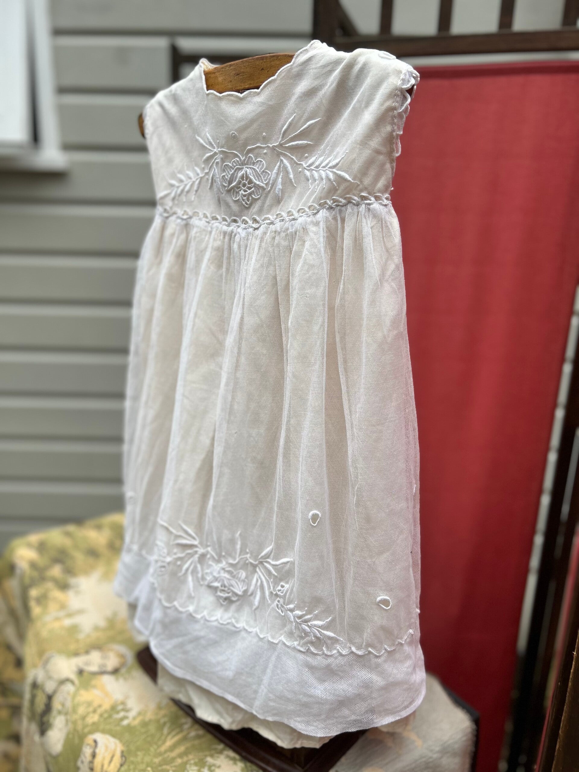 Dit jurkje is van zachtgele zijde met daaroverheen zachte tule met mooie borduursels. Is waarschijnlijk niet heel oud maar wel een schatje.