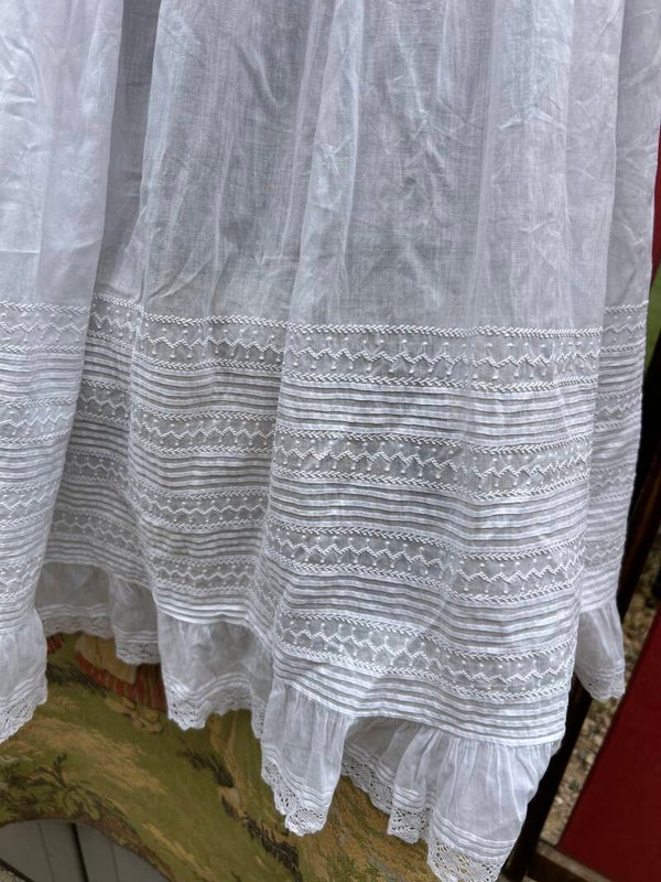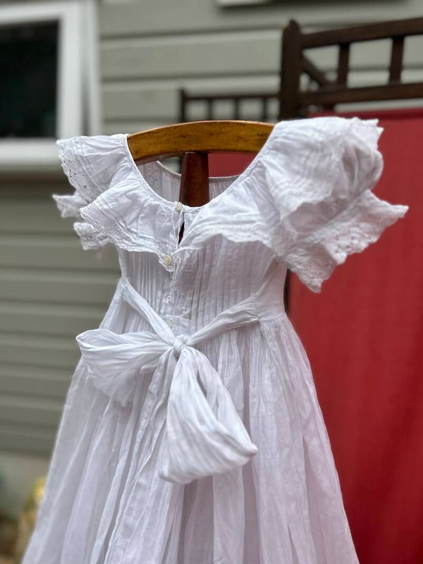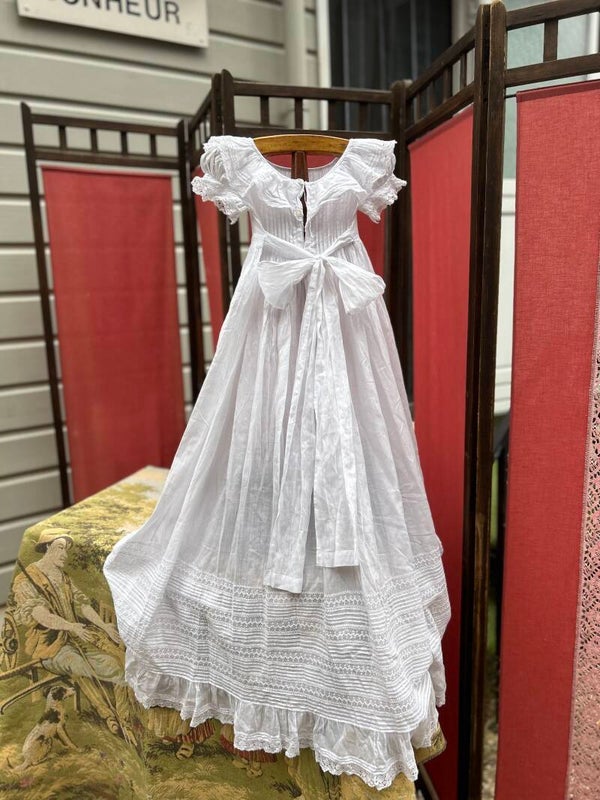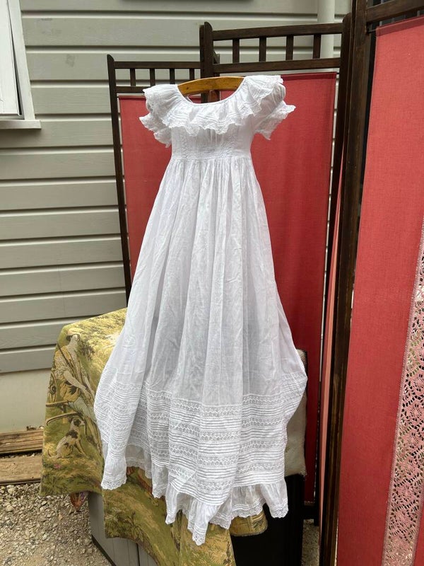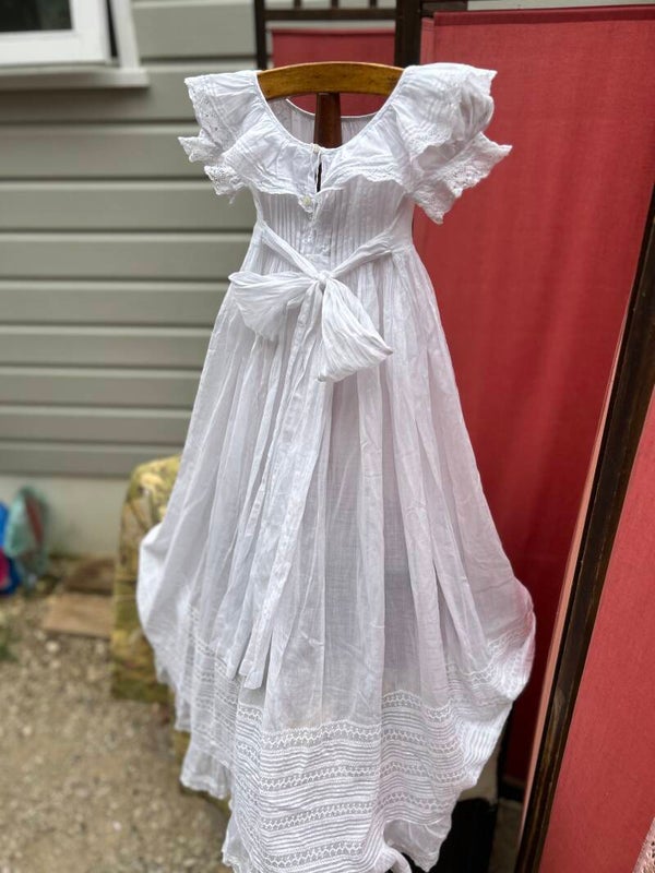 Hele mooie oude doopjurk met veel kant. Verkeert in hele mooie staat. Zo fijntjes gemaakt met veel kant, mooie stiksels, in hele dunne katoen. Aan de achterzijde sluit hij met knoopjes en extra koordje in de hals en natuurlijk een lange strik. Hij is super lang.