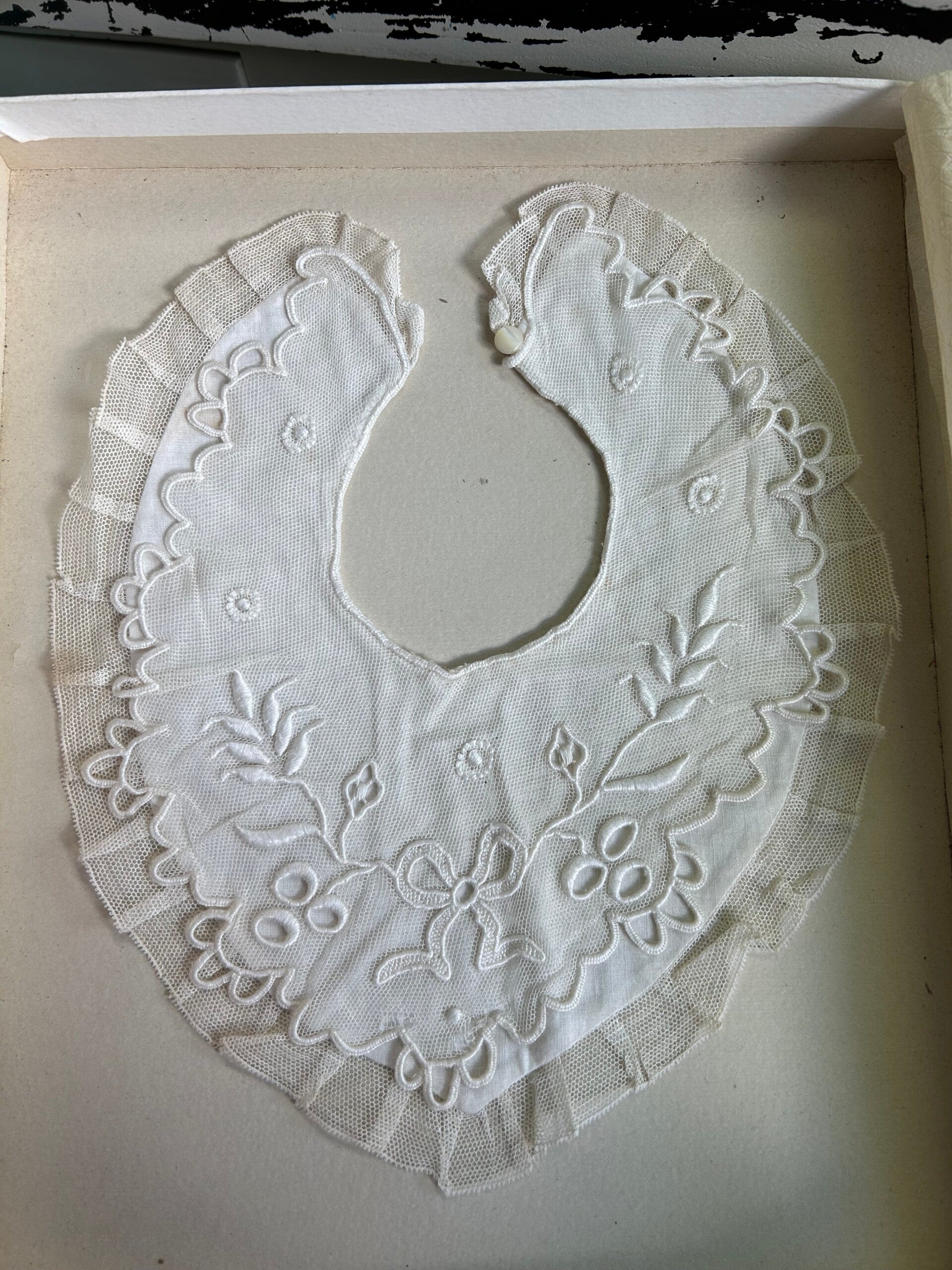Prachtig bewerkt babykraagje in hele mooie staat. Sluit achter met een knoopje met lusje.
