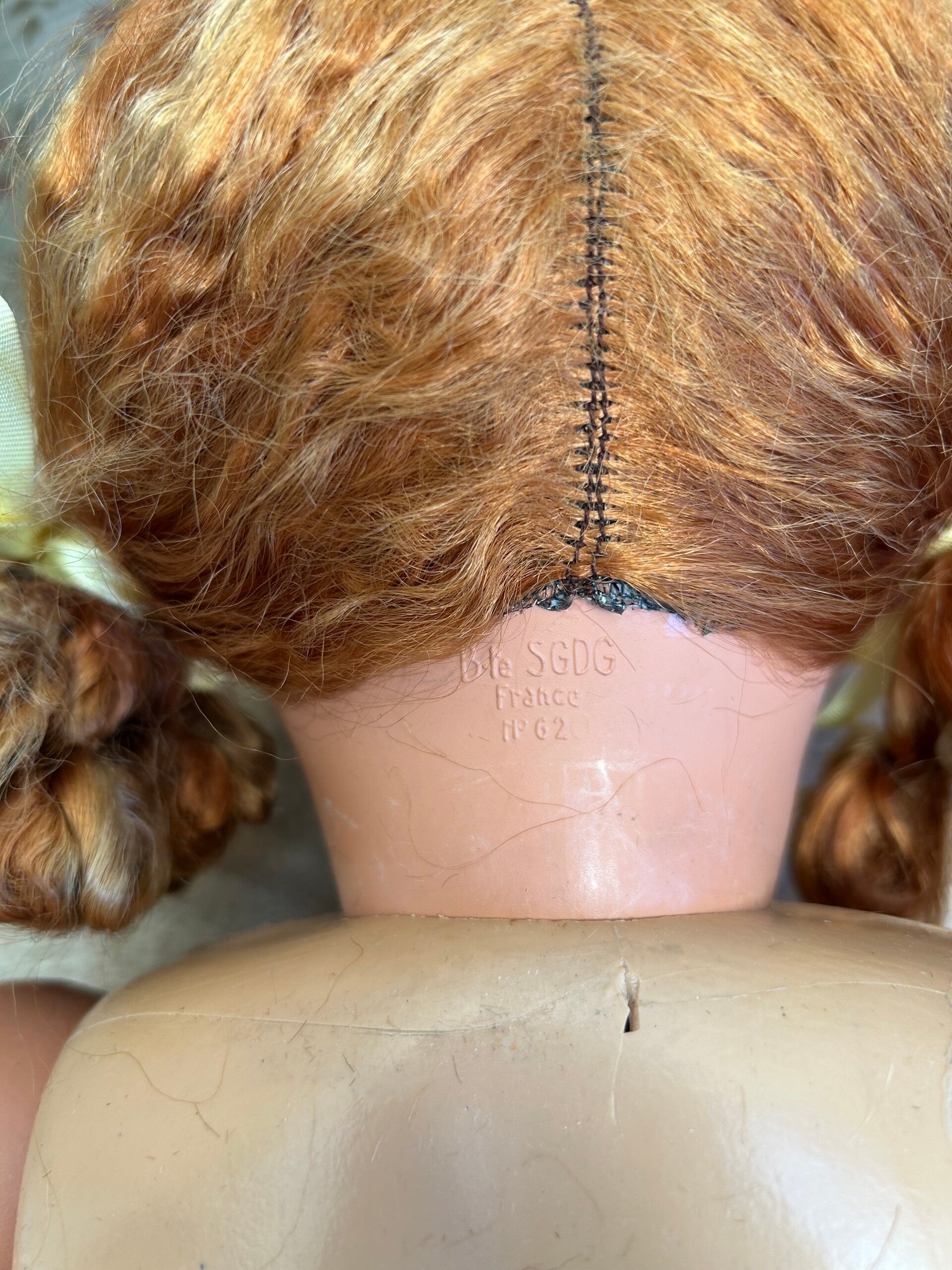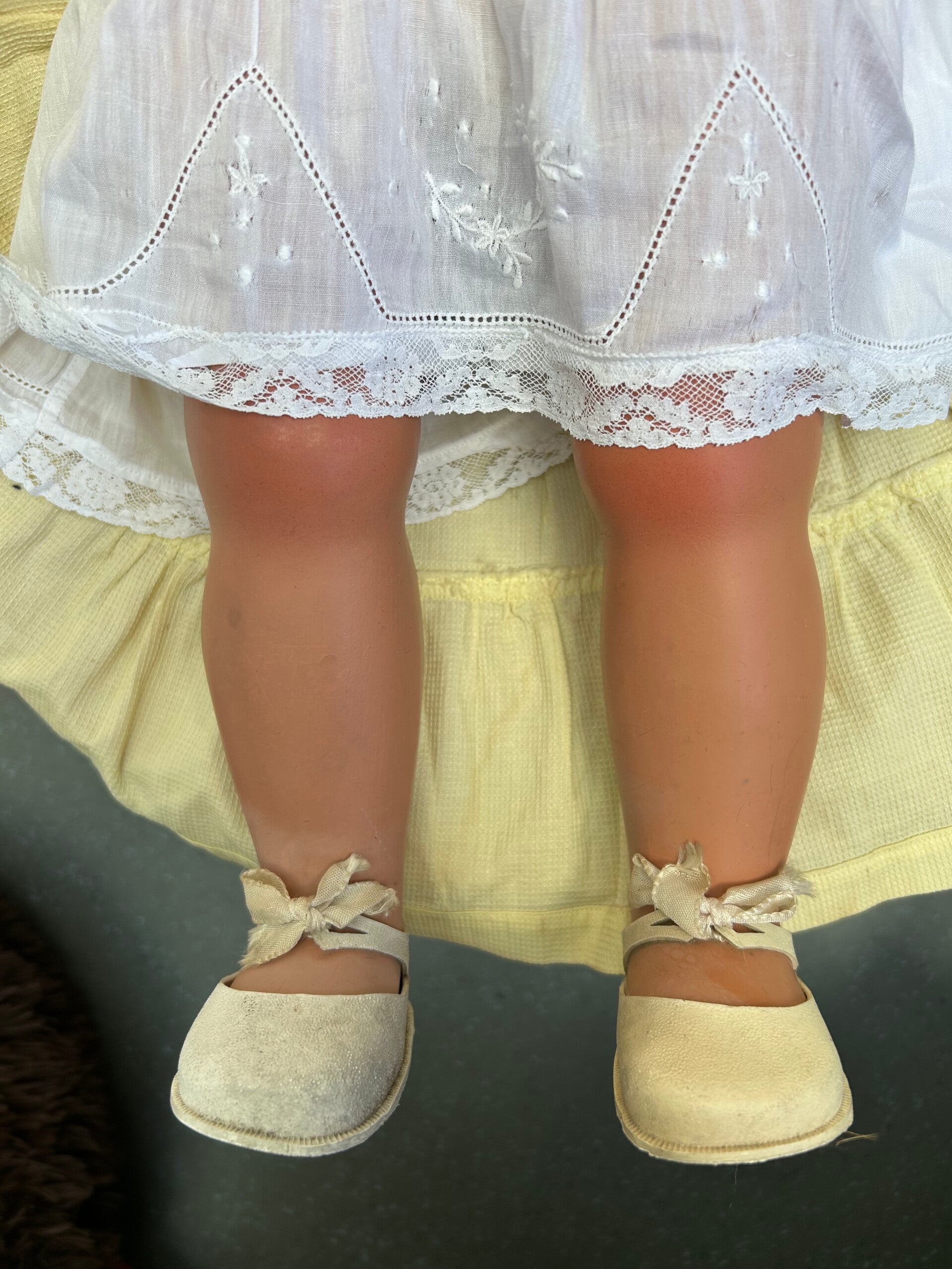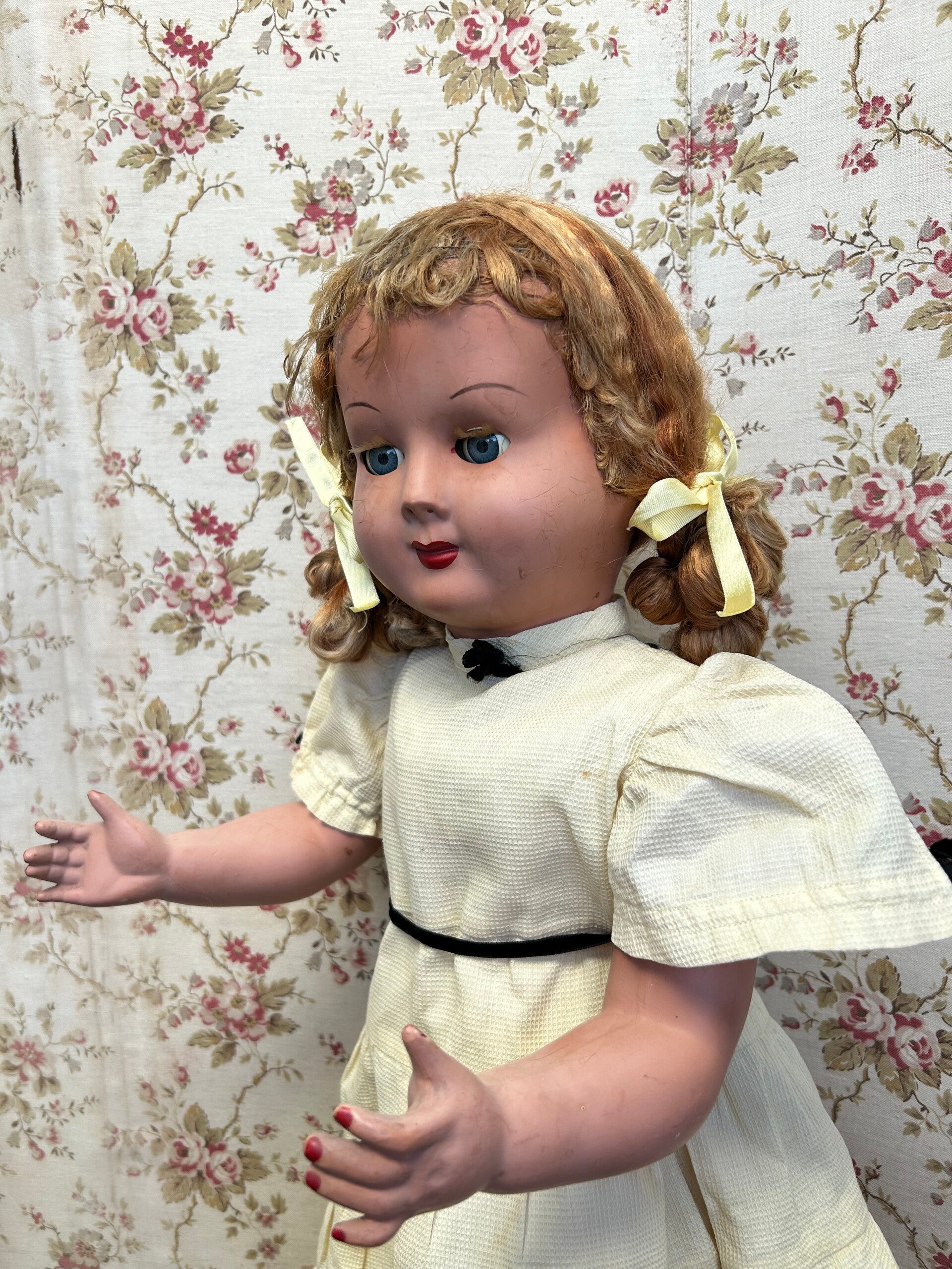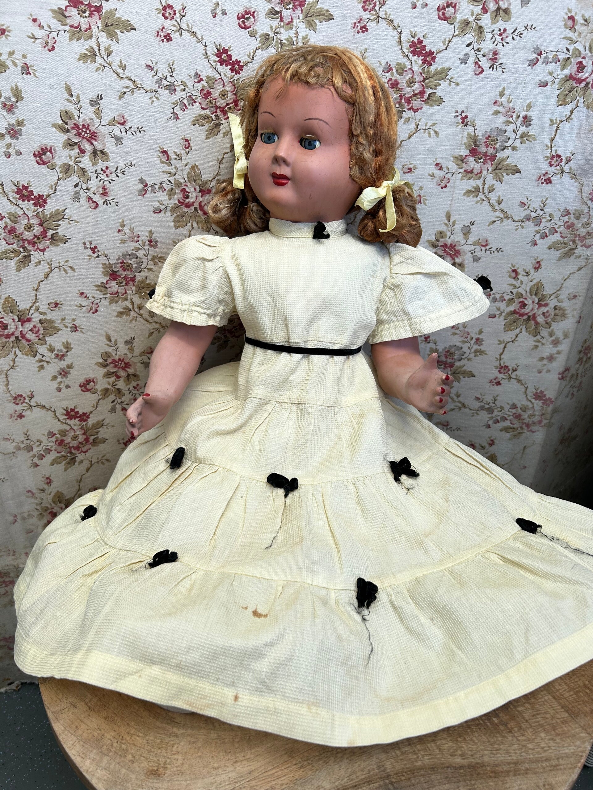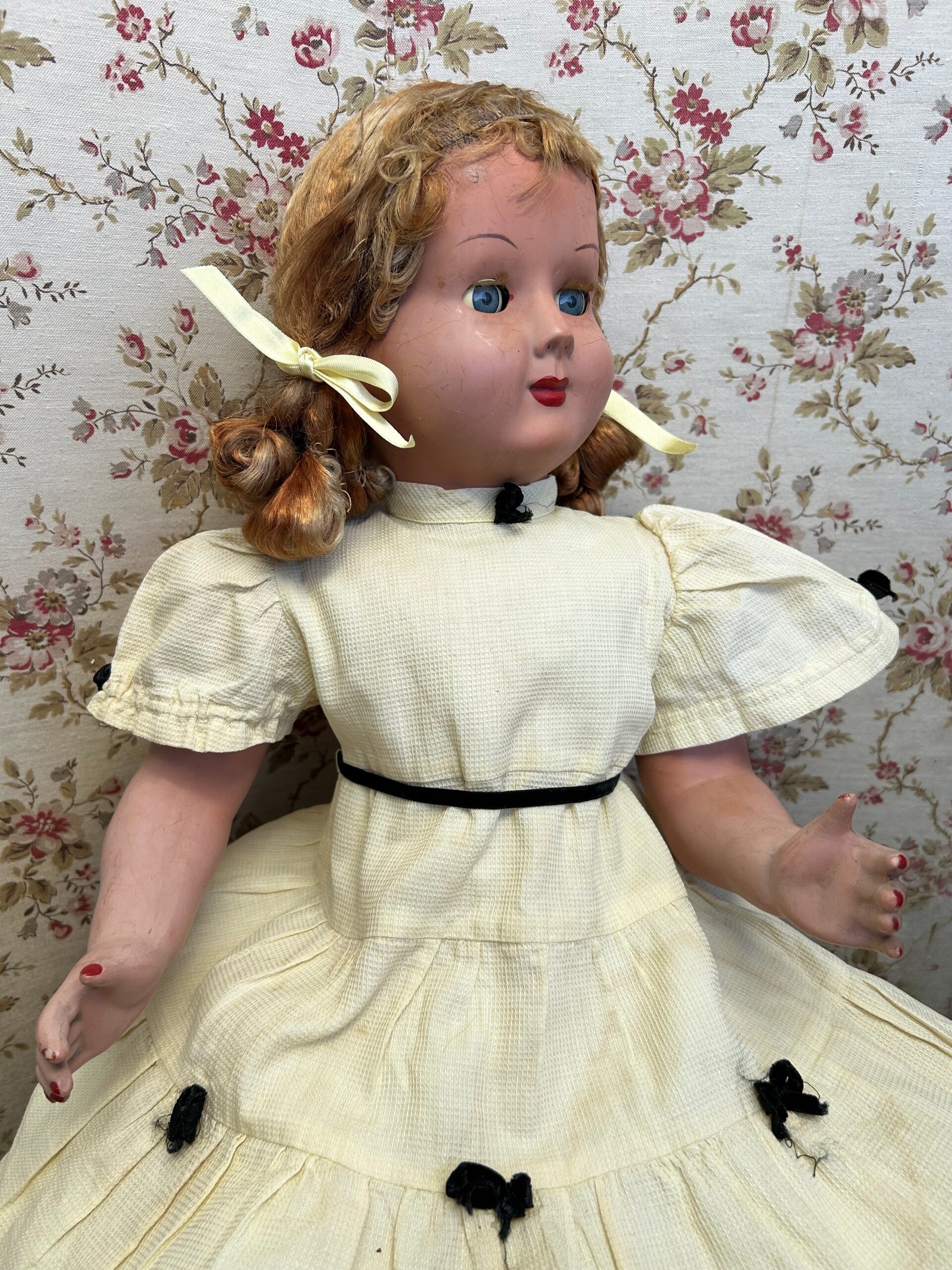 Deze vintage pop in haar gele jurkje meet 64cm lang. Haar oogopslag is vriendelijk en haar slaapogen werken goed. Haar pruik zit vastgelijmd. Ze draagt, naast haar jurkje, een onderjurk (deze is sleets) en schoentje. Ze is gemaakt van een hard soort kunstof. Ze heeft rondom haar nek reparaties, verder verkeert ze in mooie staat voor haar leeftijd.