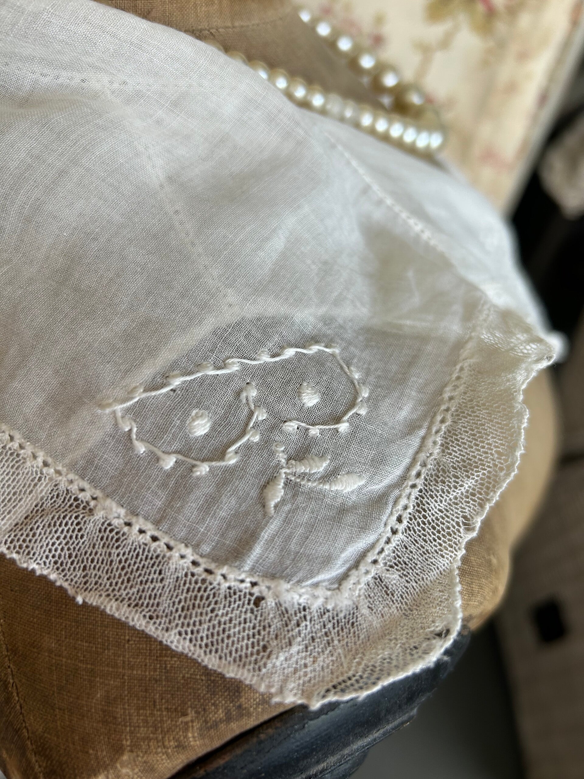 Fragiele kraag met rugpand, gemaakt van hele fragiele stof. Heeft hier en daar wel een klein gaatje. De kraag heeft lieve borduursels en is afgezet met een klein kantje.