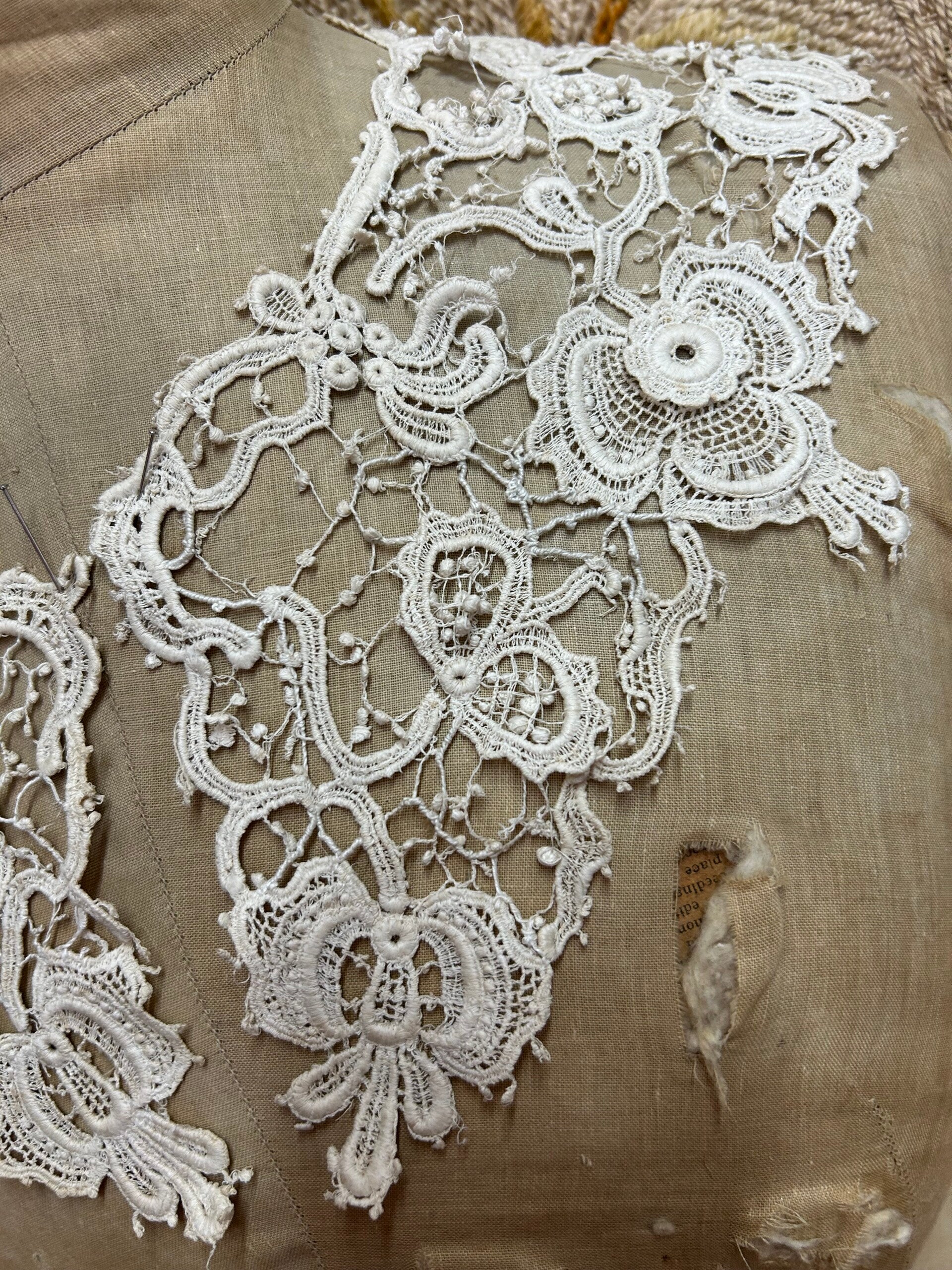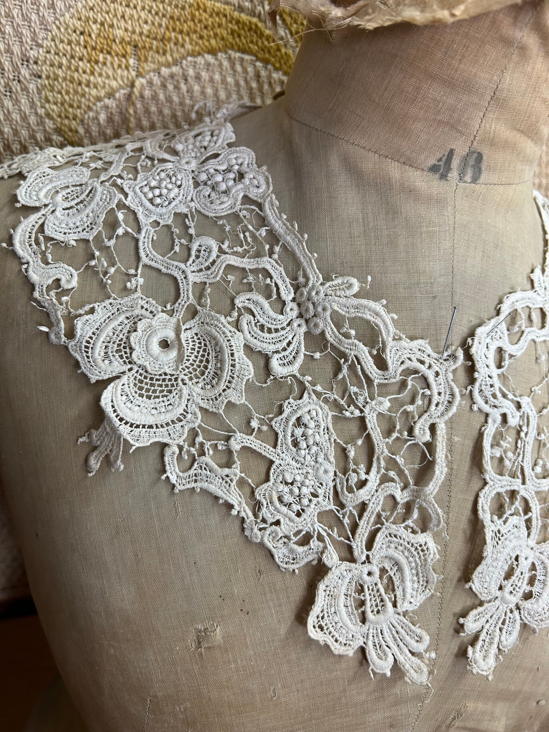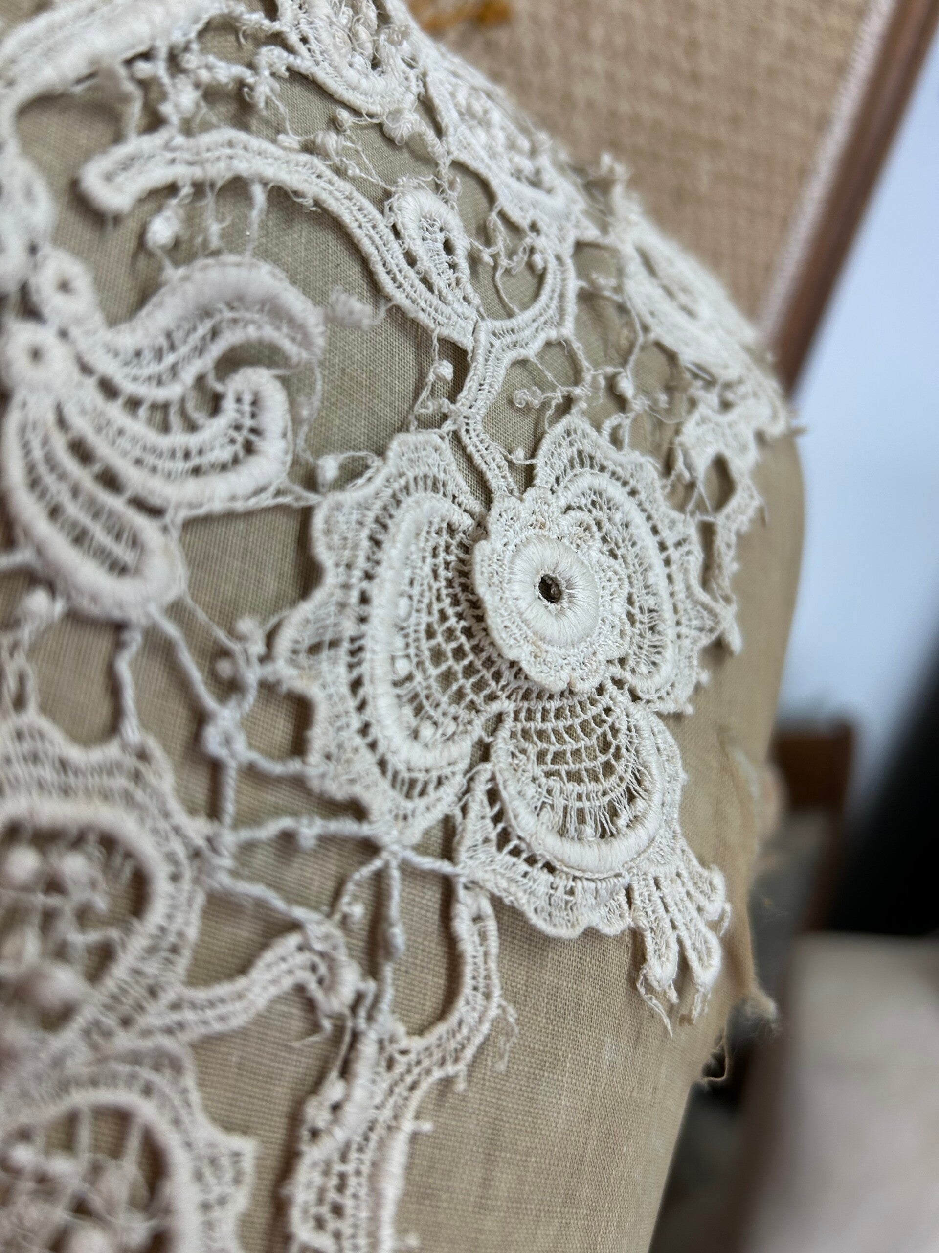 Beige oude kanten kraag, heeft hier en daar gebruikerssporen, dat wil zeggen dat er wat connecties los zijn gegaan. Dit is natuurlijk niet vreemd gezien de leeftijd. Maar nog steeds prachtig op bijvoorbeeld een paspop.